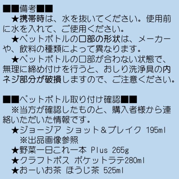 | ■■商品詳細■■ ★落札数量【1】で、【携帯用おしり洗浄具】を【1点】です。 (例)落札数量【2】で、【携帯用おしり洗浄具】を【2点】です。 ※複数個落札の時、【配送方法】で【定形外郵便】を指定すると【送料】が変動する。 ※ 複数個落札時の送料は、入札前に、下方記載の【配送方法(お届け方法) 】を、確認ください。 ★商品名・・・BotLLet ボトレット携帯用おしり洗浄具 ※水を入れる容器(ペットボトルなど)は、付属しません。 ★JANコード4956810235315 ★メーカー・・・株式会社 小久保工業所 ★スッキリ優しい3穴タイプ。 ★洗浄便座がないところでも、ペットボトルと水があればどこでも簡単にお尻が洗えます。 ※海外製のペットボトルなど、一部の規格の異なるペットボトルには取付けできません。 ★外出時や海外旅行、また赤ちゃんのおむつ替えや介護にも便利。 ★ノズルは中に収納して使用時に取り出せます。 ■■状態の備考■■ ★ 新品/未開封品 ※発送商品は、未開封品です。 ※商品パッケージのキズなどは、ご容赦ください。 ★ノズルを伸ばした状態でも、ゴム部分から、ポタポタと水が漏れ出る場合がある。 ★発送前に、パッケージ外側から、【ノズルの根元の黒色のパッキンの有無】と【ノズル先端のシャワー部分のパーツの有無】を目視にて検品します。開封後のクレーム(使用感を含む)は、、製造元に、直接、連絡してください。 ※在庫多数の為、 画像は任意の画像です。 |