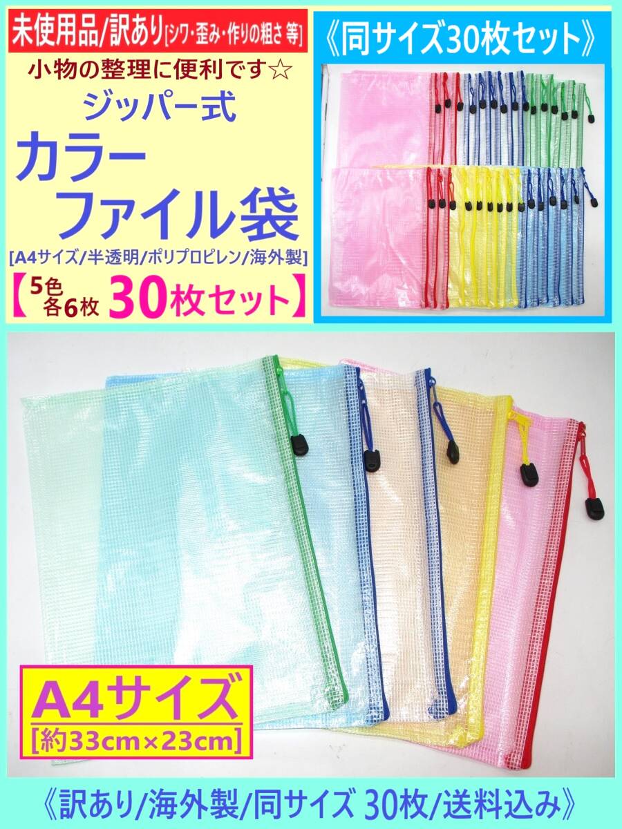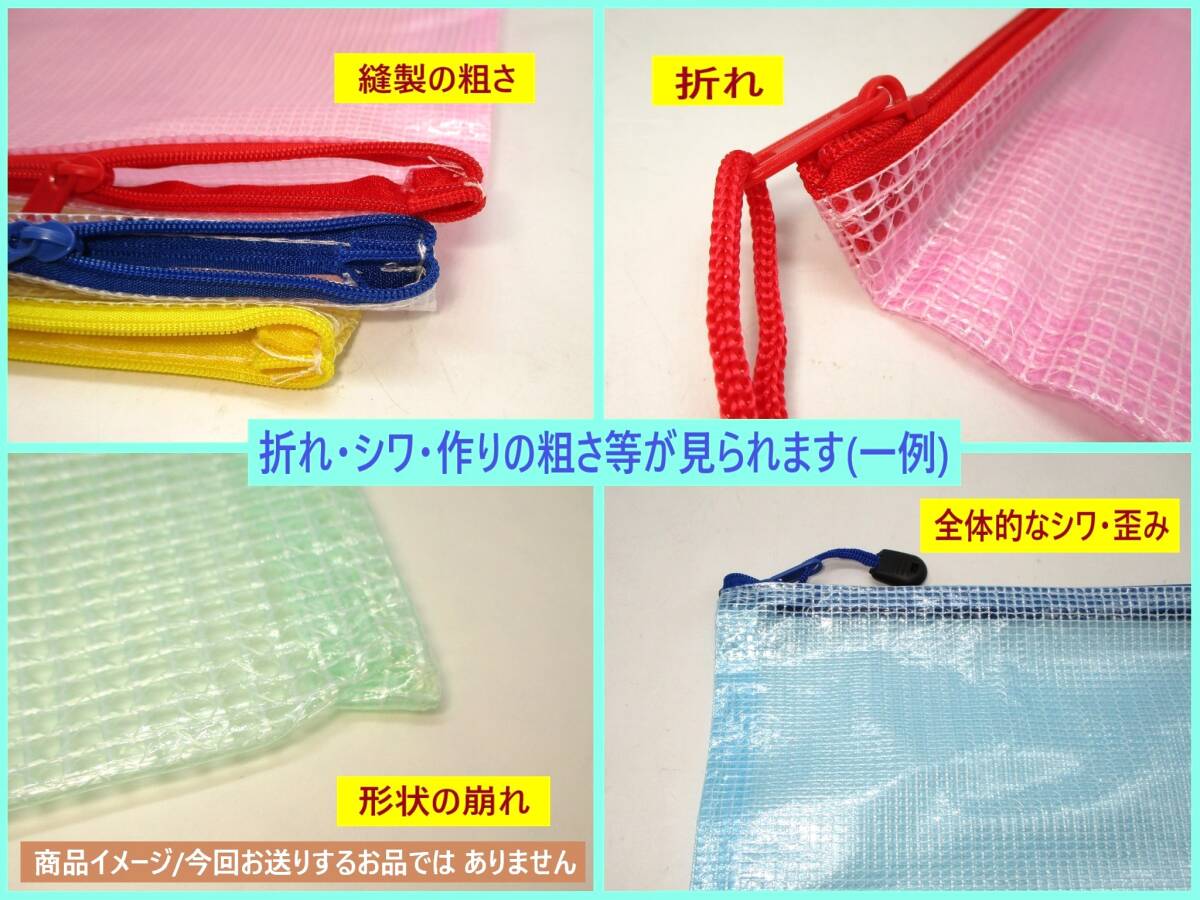 | 「訳あり」扱いの、未使用品です。 専用のパッケージなどの外装は、ありません。 ポリプロピレン製 A4サイズ相当の ファスナー式 ファイル袋です。 ポリプロピレン素材による 柔軟性・耐水性(軽く水がかかる程度)・ 防汚性などを備えたお品です。 *ファスナー部を除く 透明な素材に、 白い格子状のメッシュが 入っていることにより、 内容物がほのかに見える 「半透明」状のケースになっています。 ちょっとした文具や小物等の整理に お使いいただけるお品です。 カラフルな 5色の ファイルケース 同じ仕様の物を 各色6枚ずつ 30枚セットにして お届けします。 全体的にシワ・折れ目・キズ・形状の歪み・ 製造上の汚れやホコリの混入・ 縫製(縫い目)の粗さが見られます。 また 目視では確認出来ませんでしたが、 キズや折れ部分に 「穴」が生じている可能性があります。 この点より「訳あり」として出品いたします。 気になさる方はご遠慮ください。 以下の商品説明をよくご覧になってから、 ご検討をお願いいたします。 神経質な方、完品をご希望の方は、 御入札をご遠慮ください。 【商品内容】 ジッパー式 カラー ファイル袋 A4サイズ相当 30枚 [基本的な仕様] サイズ: 外寸/約32~33cm×23~24cm(マチなし) ファスナー開口部/約30cm *個々のお品で 多少の差異があります *ファスナー開口部が 外寸よりやや小さめの為 A4サイズぴったりの大きさの本など (厚みのある物)は 入らない場合があります 重量:1個あたり 約30g 素材:ポリプロピレン 他 その他: 海外製/メーカー等の詳細は不明 透明な素材に 格子状のメッシュ ファスナー持ち手には ヒモ付き 耐久性等は 不明 *状態などは画像にてご確認ください *実際の商品の色味とは異なる場合があります *画像1(TOP)~8は 過去の出品画像を流用しています 画像9・10は 今回お送りするお品を撮影しています ご了承下さい 【状態等】 ・未使用品です。 ・専用のパッケージなどの外装は、ありません。 ・海外製の為、作りや縫製の粗さ・ 製造上のマークや汚れ等がある 場合があります。 ・商品には、 全体的にシワ・凹み・折れ目・キズ・ 製造上の汚れ・形状の歪みが見られます。 また 目視では確認出来ませんでしたが、 キズや折れ目部分に 「穴」が生じている可能性があります。 美品・完品をご希望の方はご遠慮ください。 ・海外製の為、ファスナー部分などの強度が 弱い可能性があります。 無理な力や"ひねり"を加えますと、 破損する可能性があります。 ・長期保存品につき、 汚れ・埃の付着等がある場合がありますが、 御容赦下さい。 ・商品は、まとめてビニール製袋に入れ、 再利用段ボール箱等にて発送いたします。 以上の点より「訳あり」として出品いたします。 ご承知をいただける方のみ、 ノークレーム・ノーリターンにて、ご検討ください。 | ||