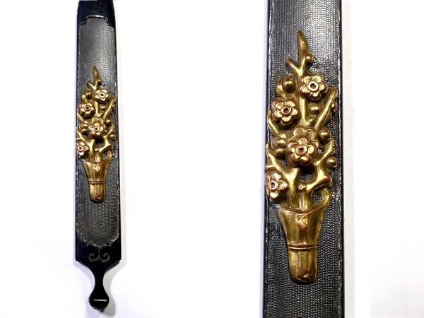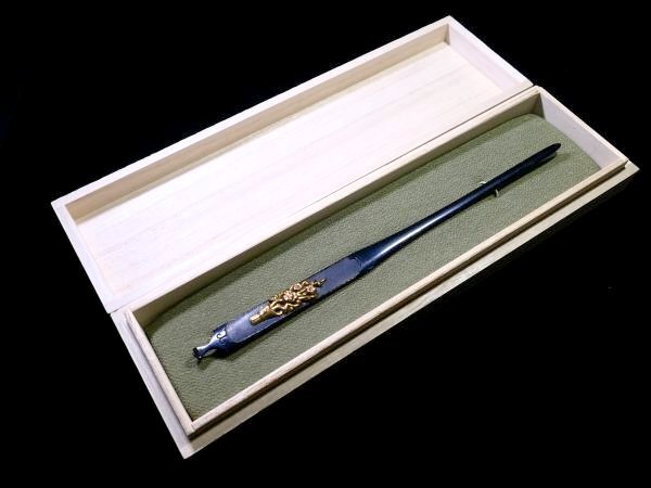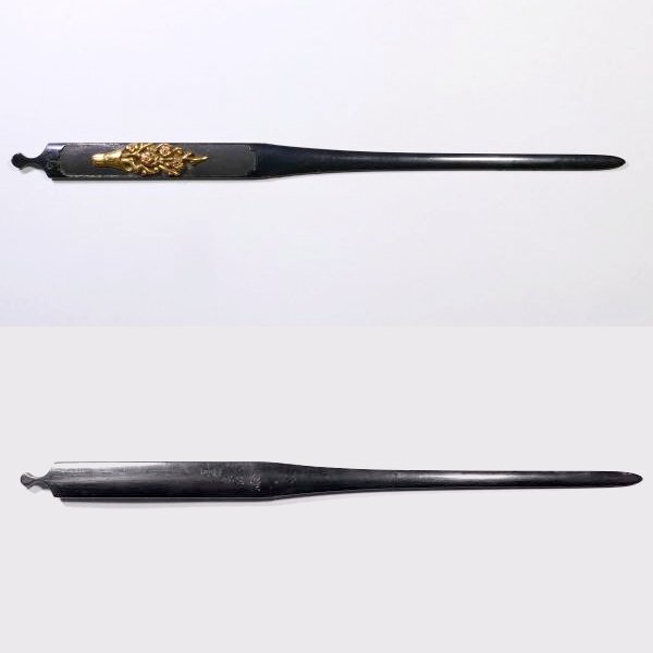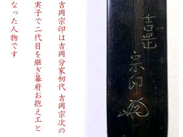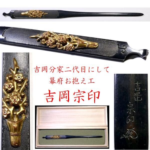 | 商品説明 | 黒々とした極上の赤銅魚々子地に 極上金色絵の見栄え良き枝梅の図が施された 「吉岡宗印」の名作です。 「吉岡宗印」は 吉岡分家初代「吉岡宗次」の実子で 二代目を継ぎ、 江戸幕府お抱え工となった人物です。 拵栄え抜群であり 観賞用にも拵用にも 幅広く活躍する一品と存じます。 この機会に是非手に入れて下さい。 寸法: 約 21.2cm × 約 1.23cm 時代: 江戸時代 材質: 赤銅魚々子地 桐箱付 銘 : 吉岡宗印 花押 状態:特に気になる傷みはなく良好。画像にてご判断下さい。 :許容範囲内の時代傷みはご理解下さい。 |