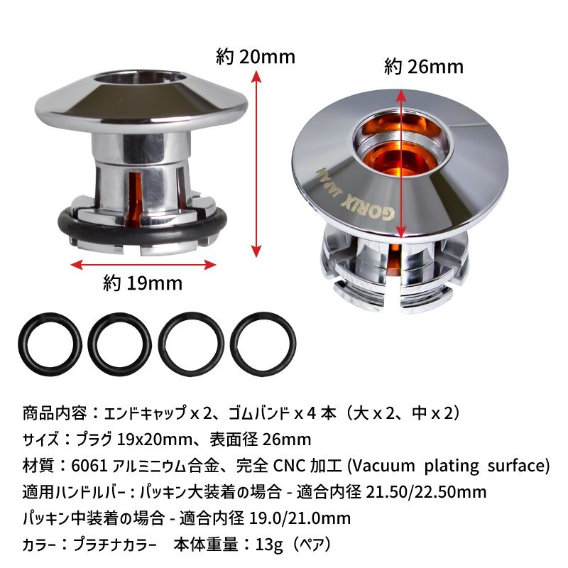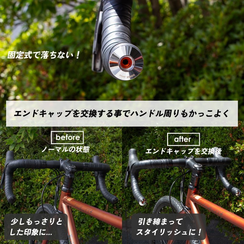 | [美しさと品格、そしてスペシャルな輝き] アクセサリーを身にまとうような気持ちになるプラチナカラーを自転車に。 クールで大人な印象を与えるプラチナカラーはシルバーやグレーが混ぜる不思議なカラー。 シンプルですが装着するとハンドル周りのアクセントになります。 装着方法はとても簡単なのでロードバイクのカスタマイズの一歩にもおすすめです。 そしてとても軽量の13gで、ちょっとした軽量化にも最適です。 6061アルミニウム合金で耐久性も良い! 知らぬ間に無くなる事が多い、バーエンドキャップですが、 その不満も固定式のエンドキャップにする事で紛失をしない。 エンドキャップをつけて六角レンチで締め付ければ装着完了です。 商品内容エンドキャップx2、ゴムバンドx4本(大x2、中x2) サイズプラグ19x20mm、表面径26mm 材質6061アルミニウム合金、完全CNC加工(Vacuum plating surface) 正味重量13g(ペア) 適用ハンドルバーパッキン大装着の場合-適合内径21.50/22.50mm パッキン中装着の場合-適合内径19.0/21.0mm カラープラチナカラー | |