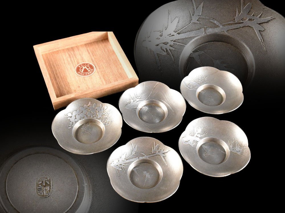 | 商品名 | 【雲】某名家買取品 中国 宗記 古錫 梅形 松竹梅絵図 茶托 托子 5客 箱付 古美術品(花形 茶道具 茶器)Y7449 LTcvxz |