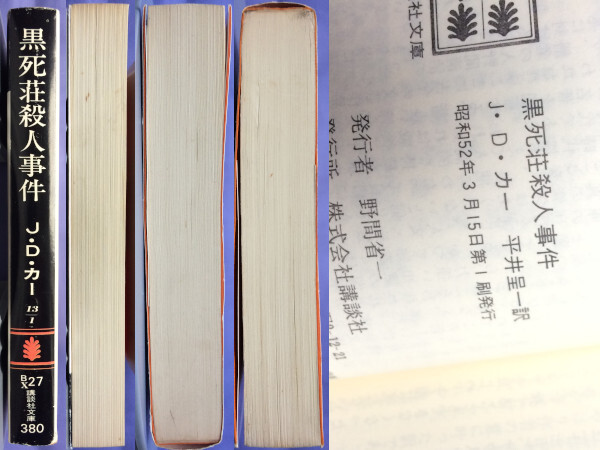 ジョン・ディクスン・カーの黒死荘殺人事件(講談社文庫)です。 カバーデザイン:K・B・K 平井呈一訳 |