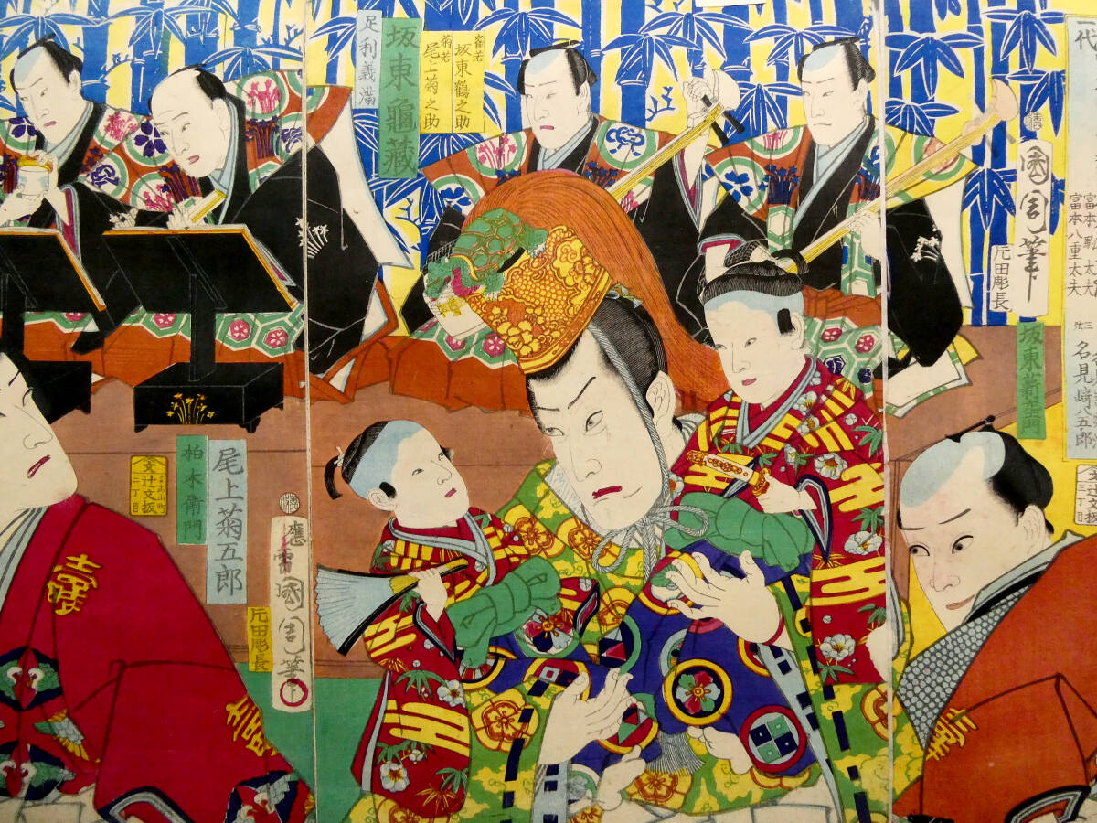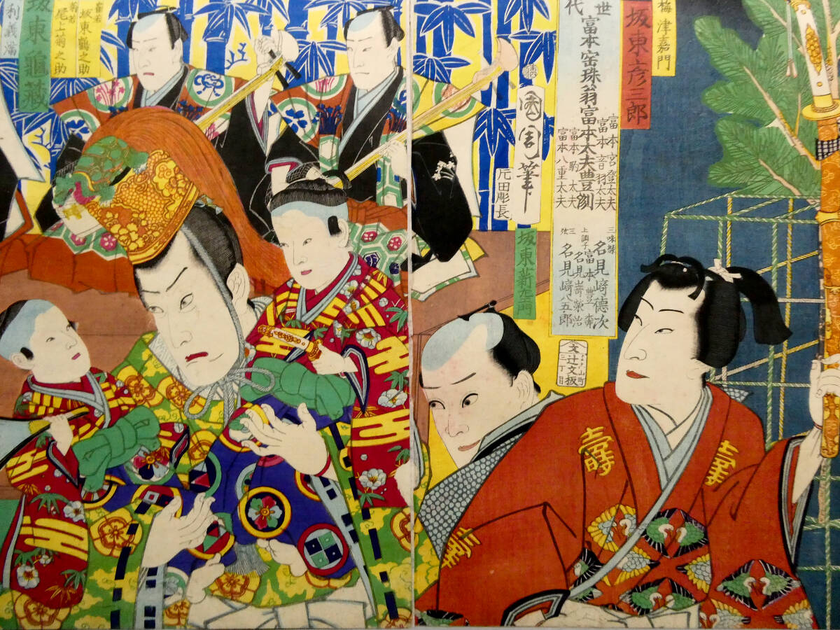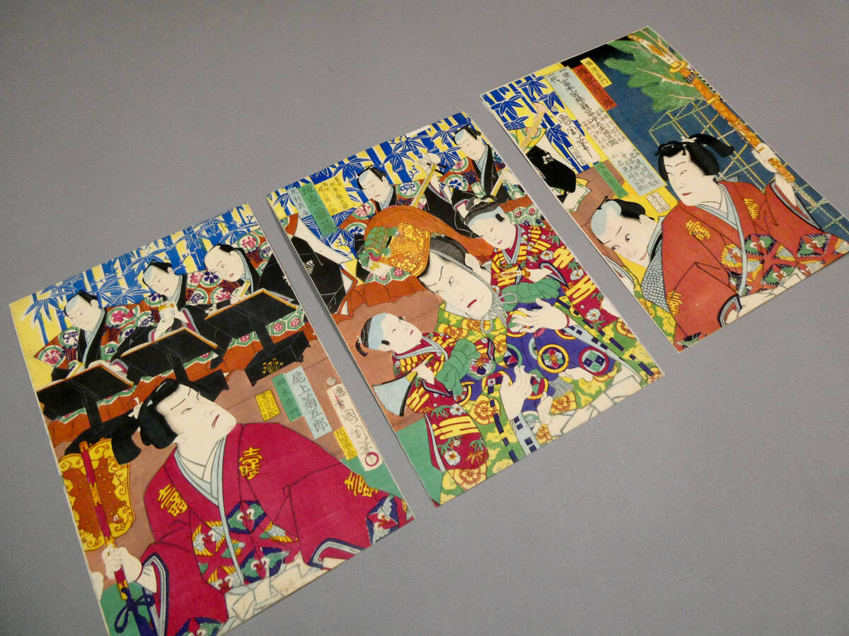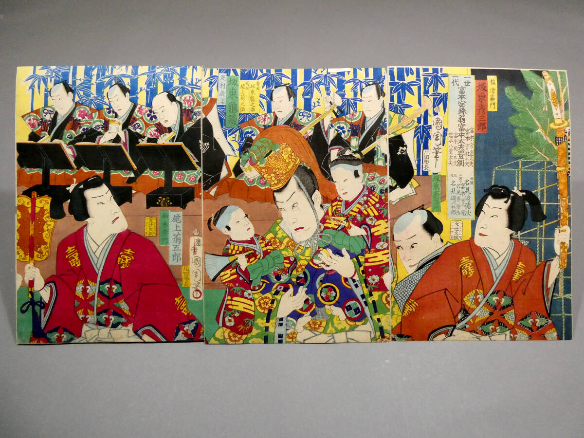 ■ 希少! 豊原国周 明治初年 木版浮世絵 役者絵 3枚続揃い 「一世一代富本宝珠翁富本太夫豊洲」 ■