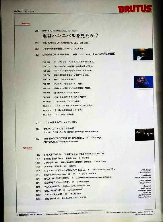 | 雑誌・情報★BRUTUS ブルータス 2001年4/15 476★君はハンニバルを見たか!?/MAKING OF 'HANNIBAL' マガジンハウス A4変版・中綴じ 01年4月15日発行 中古品 状態:並・表紙ヤヤヨレアリ・切抜き、書込み等は見当たりません ※ご入札後のキャンセル・返品は受けかねますので、商品について不明な点がございましたら、事前にお気軽にお問合せください。 ※書籍の書込みやディスクの微キズ等の状態は、できるかぎり目視で確認しておりますが、見落としについてはご容赦願います。 | ||