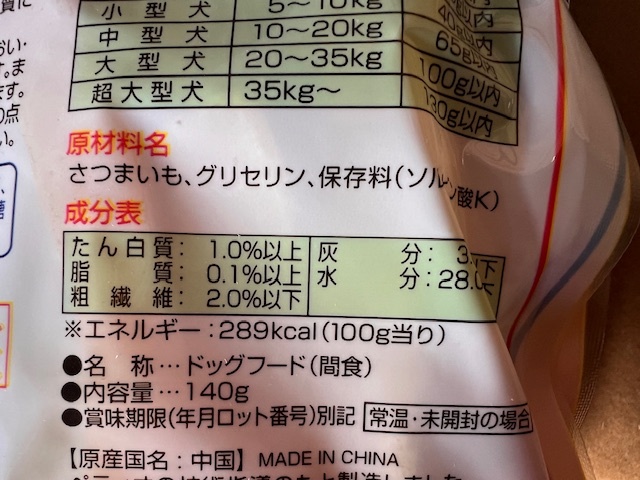 | * 商品説明 * さつまいもの自然な甘さと豊富な食物繊維で、おなかの健康にうれしい人気のおやつ。 シニア犬も食べやすいやわらか仕上げ。 中国産 140g入り×3個パック×4セット(12袋分)賞味期限2026.06月末 ※商品重量約1840g 未使用新品です。 在庫処分品とご理解の上ノークレームノーリターンでお願いします。 | ||||||||
