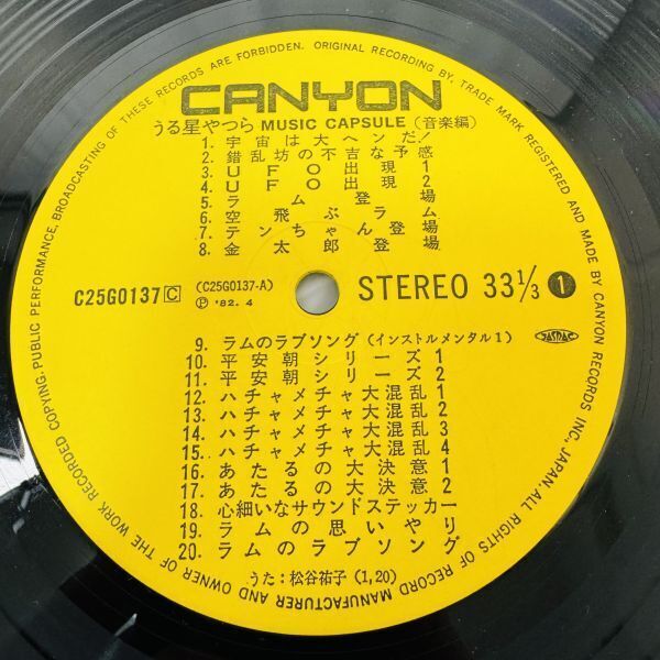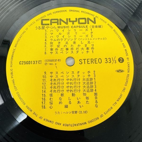 ご覧いただきありがとうございます。 アニメ『うる星やつら』のBGMを収録したLPレコード 「MUSIC CAPSULE(音楽編)」 です。 ジャケット無し、レコード盤のみ の出品です。 基本情報 タイトル:うる星やつら MUSIC CAPSULE(音楽編) レーベル:CANYON / キャニオン 規格番号:C25G0137 フォーマット:LP / 33 1/3 RPM / STEREO 年代:1982年 表記あり 収録例:ラムのラブソング(インスト)、各種BGM ほか ※ラベル写真をご確認ください。 付属品 ジャケット:なし 内袋:写真のとおり(ある場合のみ) 盤のみの出品です。 コンディション 盤面:中古相応のスレ・薄キズ等あり得ます(クリーニングは未実施)。 再生確認:盤面:目視で薄いスレあり。試聴確認は行っておりませんが、 目視での検品を行いました鑑賞には問題ありません。 画像が現物です。状態は写真でご判断ください。 注意事項 ジャケット欠品の現状渡し・ノークレームノーリターンでお願いします。 中古品の特性上、完全品や美品をお求めの方はご遠慮ください。