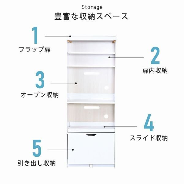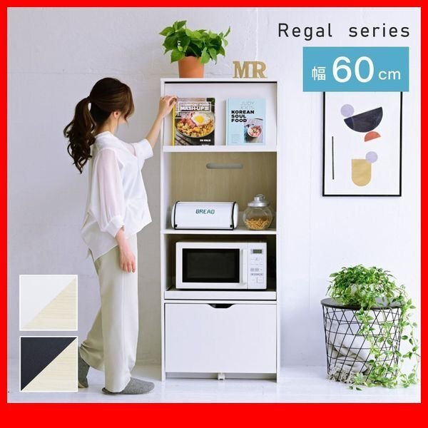 | さりげないツートーンが印象的なキッチンシリーズRegal。 コンパクトながらもオープンラックやスライド収納、フラップ扉に引き出し収納など、豊富な収納を備えた機能的なレンジ台です。 引き出しは2Lのペットボトルも入るサイズ設計。 |