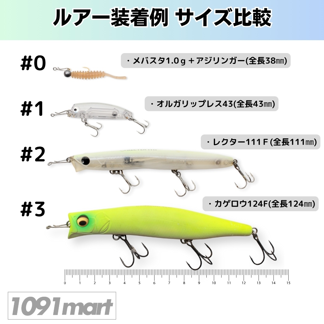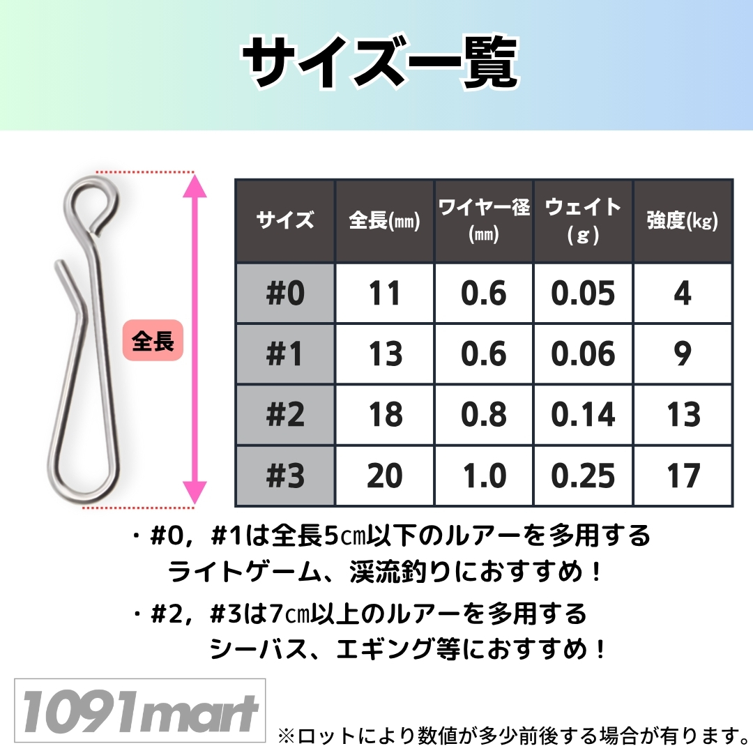 | サイズ | 全長(mm) | ワイヤー径(mm) | ウェイト(g) | 強度(kg) |