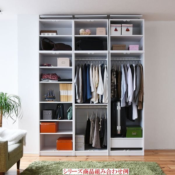 2つのハンガーバーと可動棚の高さは好きな位置に変えられるので収納物に合わせて使用できます。 上にはアウター、下にはスカート。上には洋服、下にはストールやベルト、ネクタイなどのファッション小物と自由自在。 |