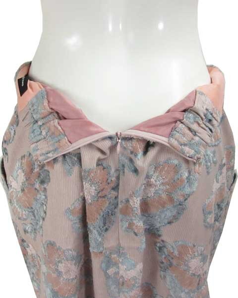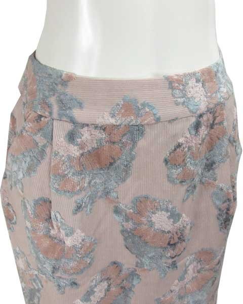 | くすみピンクのクラッシック風スカート。お花柄部分はベルベット風デザインとなっていて、やや光沢があり、高級感があります。秋冬におすすめのスカートです。 |