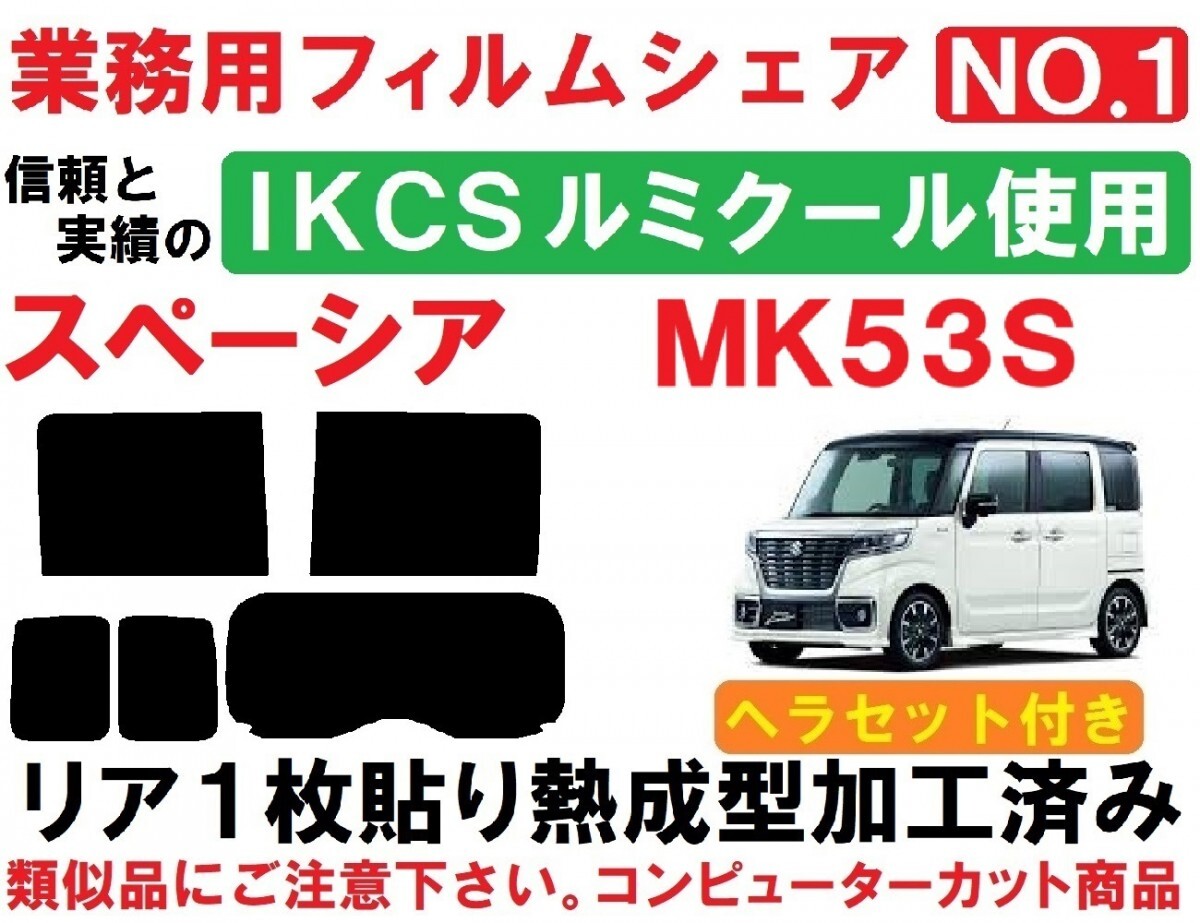 | MK53S スペーシア・スペーシアカスタム用『IKCSルミクール使用』1枚貼り成型加工済みフィルム リア5面セットです。(専用施工液付き) ・信頼の品質と実績で永い間業務用フィルムとして選ばれ続けているIKCS製品です。 ・業務用フィルムの中で最も信頼性の高い、ベストセラー商品です。 ・詳しくはアイケーシーエス株式会社HPをご覧ください。 ※『ルミクール』は当店でも 施工実績・販売実績NO.1の超人気商品です。 平成29年12月~ スペーシア・スペーシアカスタム・スペーシアギア MK53Sに適合します。 ※適合等 ご不明な点など有りましたら、お気軽にご質問下さい。 ◇◆◇当商品には、画像2のヘラセットが付属します◇◆◇ ■滑りの良いシリコンタイプのゴムヘラ スムーズに水切り(清掃)・貼り付け後の水抜きが出来ます。 実際の業務でも色々な物を試しましたが、シンプルなこの形状・このメーカー・このグレードの物が1番使いやすいです。 柔軟性が有りガラス(フィルム)に密着するため、フィルム折れも防げます。 ■使いやすい厚みとコシの有るプラヘラ 形状は似ていても各メーカーにより硬さ・厚みなど色々と有ります。 慣れていない方でも扱い易いように少々柔らか目の物になります。 ヘラ先にはフッ素樹脂加工のクロスを貼って有りますので、滑りが良くキズを防止します。 ■ワイプオール(不織布ワイパー) 布同様の丈夫さと紙の持つ吸水性を発揮。糸くずの発生が無く均一素材のため異物混入の心配が有りません。 施工前のガラスクリーニング~施工時にフィルムが触れる可能性の有るガラスの周りのゴム部品の拭き取り清掃~吸水等に大変便利です。 全て実際の業務に使用している物で、その中から使いやすい物を選んでいます。 ヘラセットがご不用の場合、フィルムのみの商品も有ります。こちら ◇◆◇精密コンピューターカット◇◆◇ 貼りやすさを最優先に各部のサイズ・形状など微調整し、改良を重ねた独自のデータを製作。 高精度な最新・大型カッティングプロッターによるカットで正確で滑らかなカットラインを再現しています。 施工業者だからわかる、貼りやすいサイズ・形状に仕上げています。 ◇◆◇リア1枚貼り成型加工済み◇◆◇ リアガラスの湾曲に合わせて熱成型加工して有りますので、平面に貼るのと同様にたるみが出ず1枚貼り出来ます。 ※最適な状態に成型加工して有りますので、ヒートガン(ドライヤー)等は不要です。 ◇◆◇専用施工液付属◇◆◇ 軽視されがちな施工液ですが、貼りやすさに大きく関わる部分になります。中性洗剤などで代用せず、必ず付属の専用施工液をご使用下さい。 濃度については車種・季節などにより変わりますので、個別にお知らせ致します。 国内シェアNO.1の『IKCSルミクール』を使用しています。 ※『ルミクール』は当店でも 施工実績・販売実績NO.1の超人気商品です。 IKCルミクールは経年退色が極めて少ない着色加工技術はもちろん、安定した冷暖房効率をアップする熱線遮断効果や断熱効果、内装を守り日焼けを防ぐため、全てのフィルムで99%の紫外線カットを実現しています。 ガラスの飛散防止効果で高い安全性を保ち、ハードコートタイプなのでキズにも強いカーフィルムです。 信頼の品質と性能で、永い間業務用フィルムとして選ばれ続けています。 ■フィルムの種類■ 可視光線透過率 3% NS-003HC 可視光線透過率 7% NS-008HC 可視光線透過率13% NS-015HC 可視光線透過率20% NS-020HC 可視光線透過率30% NS-030HC 可視光線透過率46% NS-045HC ■全商品、キズに強いハードコート・紫外線(UV)99%カットです。 ※可視光線透過率が低くなるほどフィルムの色は濃くなります。 サイドとリアで濃さを替えたり等、可能です。 部分的にフィルムが必要になった場合、単品販売も承ります。 他にもスペーシア用フィルム、各種出品中です。こちらもご覧ください。 下記のOEM車両にも適合します。 ・マツダ フレアワゴン(MM53S) ご不明な点など有りましたら、お気軽にご質問下さい。 | ||