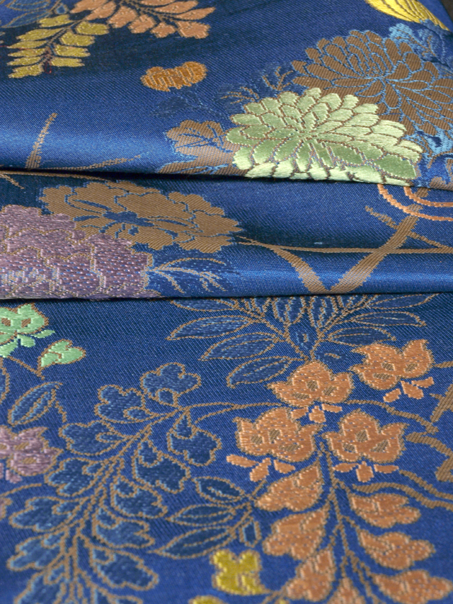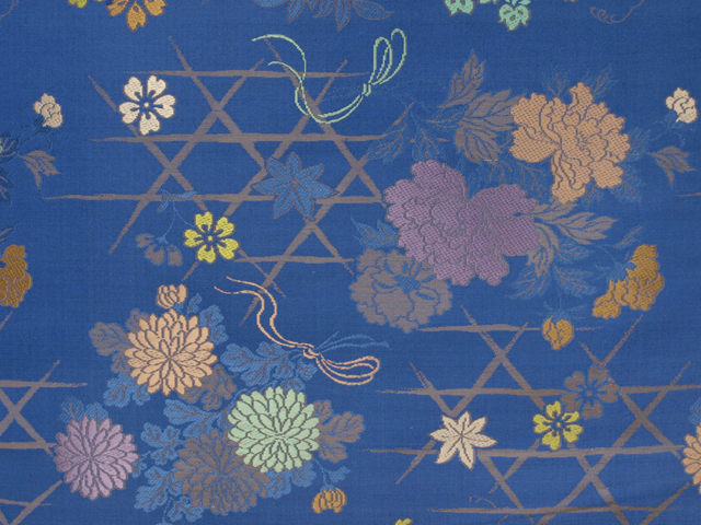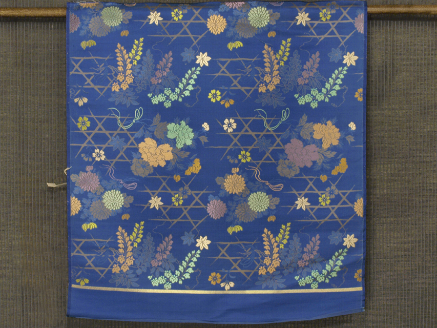 瑠璃紺(るりこん)色の地に、やぶれ籠目と牡丹(ぼたん)や菊、藤、桜などの花束の文様が織り込まれた、錦織の帯地のはぎれです。丸帯の残布と思われます。 大正から昭和初期ごろにつくられたと思われるアンティークのお品です。さわやかさのある地色に華やかなお色目の文様が美しく、かわいらしい印象です。 残布なので未使用保管品です。目につくしみやよごれ、褪色などのダメージはなく、この時代のものとしてはとてもきれいな状態です。生地の力はあります。 |