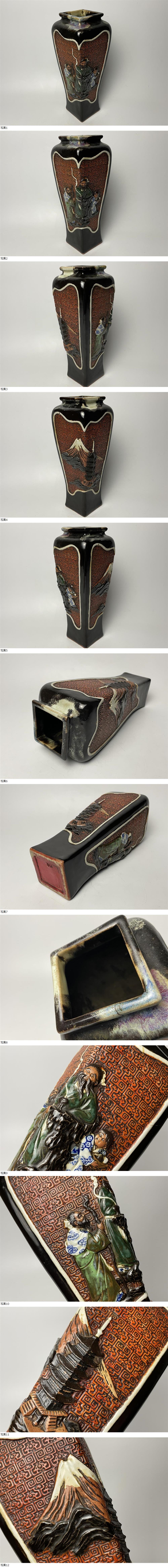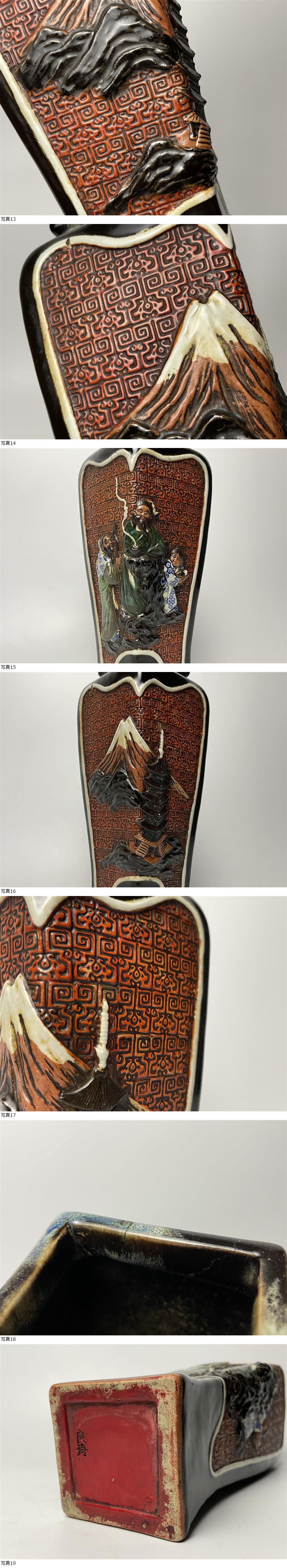 | 【井上良斎】 明治期 浮彫人物図花瓶 富士山五重塔図 隅田焼 高さ約31cm |