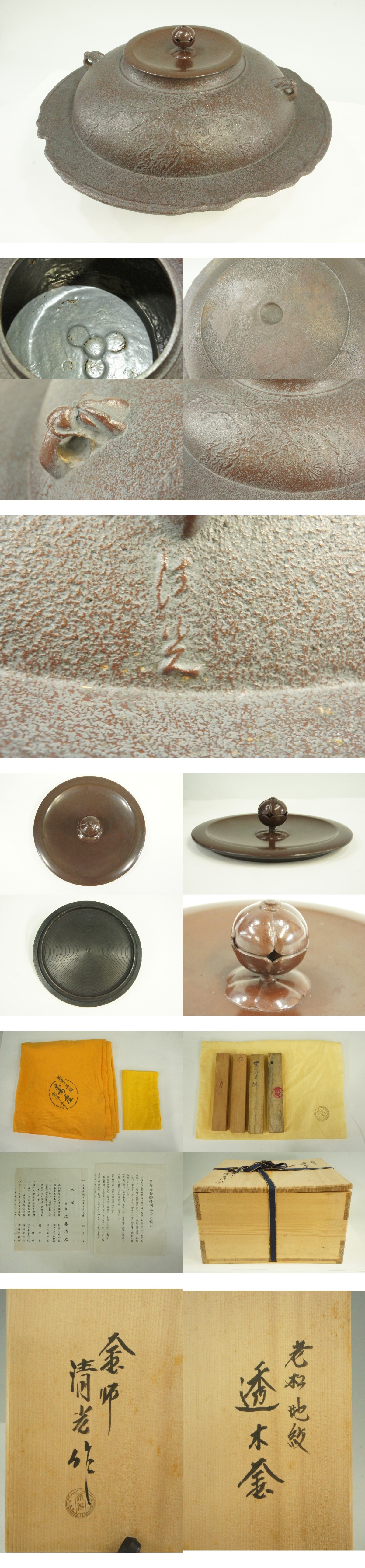 ●春のお茶道具先取り 釜師 佐藤清光 老松地紋透木釜 共箱 共袋 唐銅蓋 透木 傷や汚れ有 茶道具