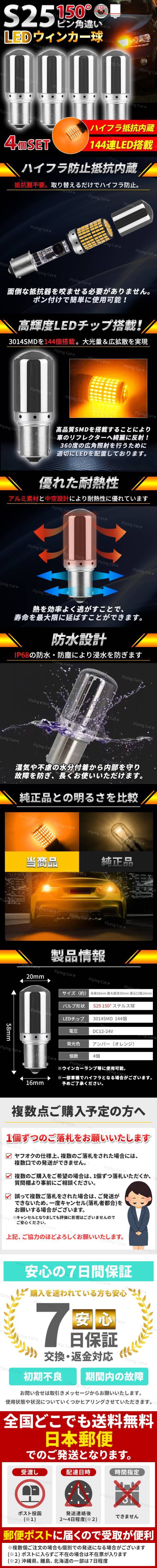 【匿名配送】S25 150度ピン角違い ハイフラ抵抗内蔵 LEDステルスウィンカーバルブ球 アンバー(オレンジ) 4個セット ■多機能&高性能のLEDライト 12Vから24Vの車両に対応し、多様な車種に対応可能です。 鮮やかなアンバーカラーでドレスアップ、カスタムにも。 キャンセラー内蔵になります。 ※すべての車種でキャンセラー解消というわけではありませんのでご了承ください ■爆光 高輝度&拡散照射仕様 高輝度の3014SMD LED144連搭載で、極光を実現。 超拡散レンズ(フルカバー)付きで全方位を明るく照らします。 省エネで純正ハロゲン球よりも明るく、およそ3倍の明るさ。 ■簡単取付け&多用途利用 全幅がS25純正球と同じサイズなので、ウインカー、コーナーランプ、リアフォグランプ、ターンシグナルランプ、テールランプ等にご使用いただけます。 無極性ですのでそのまま差し込むだけで簡単に交換可能です。 ■スタイリッシュなステルス球 クロームメッキを施したステルス仕様のため、本体SMDが目立たずスタイリッシュでドレスアップに最適です。 ■様々なメーカーに取付け可能 トヨタ/レクサス/ホンダ/ニッサン/スバル/三菱/ダイハツ/スズキ など、軽自動車、普通自動車問わず、各自動車メーカーに適合します。 ※車種により適合を確実に保証するものではございません。 |