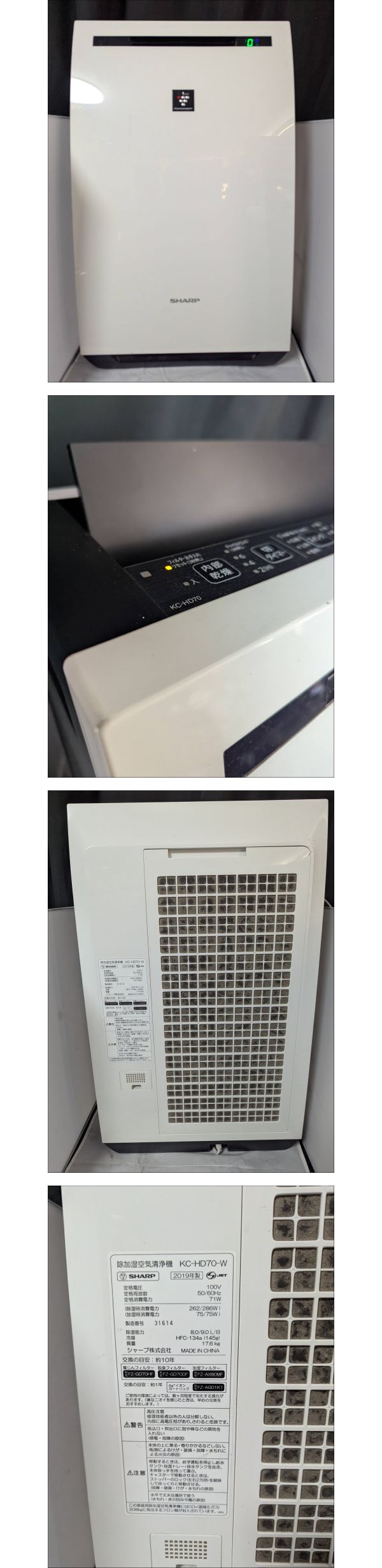 | 商品説明 | 【商品について】 ご覧いただきありがとうございます。 この度出品いたしますのは「 ●SHARP シャープ 除加湿空気清浄機 KC-HD70-W 2019年製 プラズマクラスター7000 ホワイト 除湿 加湿● 」でございます。 個人所有物の整理のため、出品する運びとなりました。 中古品ではございますが、ご活用いただける方にお譲りできれば幸いです。 商品の状態、付属品、寸法等につきましては、掲載写真にてご確認をお願いいたします。 補足:当方、ペットの飼育および喫煙の習慣はございません。お気にされる方はご参考ください。