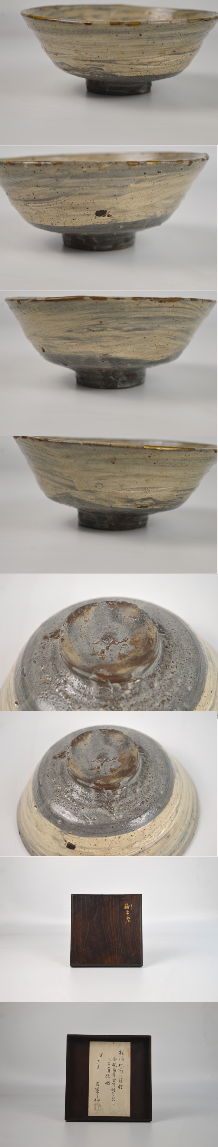 【商品名】 刷毛目茶碗 松浦肥前守 鎮信 箱蓋筆/古筆了仲 極 商品サイズ: 幅 15.2cm 高 6.3cm ※若干大きさに誤差はあります。 ※サイズは品物の最も端から端までを表記いたします。 状態: 口縁に金直しがございます。経年によるスレ・時代なりの劣化は見られますが、 ご鑑賞・お点前に支障のない範囲と判断しております。 ※時代による劣化を気にされる方はご入札をお控えください。 発送サイズ:60 ※送料は下記送料についての表をご参照下さい。 当社が出品している商品は直接ご覧になることも可能です。 下記までメールにてご連絡いただけましたらご用意致します。 info@sagami-ya.com ※当社が扱っております品物は古美術品となりますので、神経質な方はご入札をお控えください。 ※商品写真をご覧になるモニター環境、商品の素材などの特性により、色合いなど実物と多少誤差が生じる場合があります。 画像とイメージが違う等のキャンセルはお受け出来ませんので予めご了承ください。 ※木箱(合わせ箱について) 保存・保管のみを目的とした木箱であり、出品中作品との関連性は一切ございません。 稀に他の作品名・作家名が書き付けられた木箱をお付けしている場合がございます。 誤認防止のため書き付け部分の画像は掲載いたしません。ご了承下さい。 ※箱の状態は表記いたしませんので写真をご参照下さい。箱紐は掲載が無い場合は付属しておりません。 |