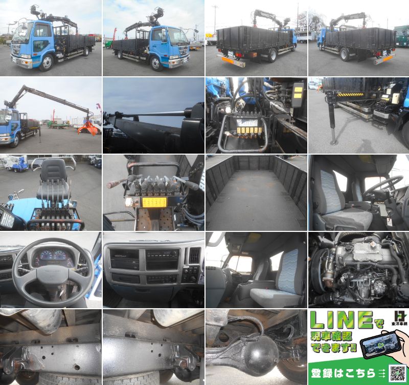 ヒアブクレーン付平ボディ 上物:ヒアブ製 上物同年式 3段ブーム トップシート 360度回転グラップル付 積載2.6t 荷台寸法:510×213×78 荷台床:鉄板張り アオリ5方開 増トン車 224馬力 走行17万㎞ 6速ミッション 車検付(R9/2/18) 大型免許対応車 排ガス適合(各都市登録&乗り入れ可) タイヤサイズ:245/70R19.5 |