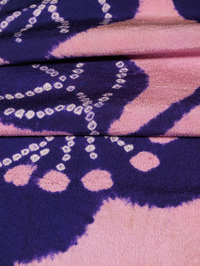 やや沈んだ桃花色の地に、鹿子(かのこ)の配された青紫色の唐花草の文様が染められている、縮緬のはぎれです。 明治末から大正期ごろにつくられたと思われるアンティークのお品です。大きめのシボの縮緬地です。 全体的にアンティークなりのくすみがあるほか、ところどころに直径約 1mm-1cm の黄変やうすよごれがポツポツとあります。そのほかに目につく大きなしみやよごれ、褪色などのダメージはありません。生地の力はまだまだあるようです。※風楽の出品内で同じ柄のものを複数出品している場合もあります。 |