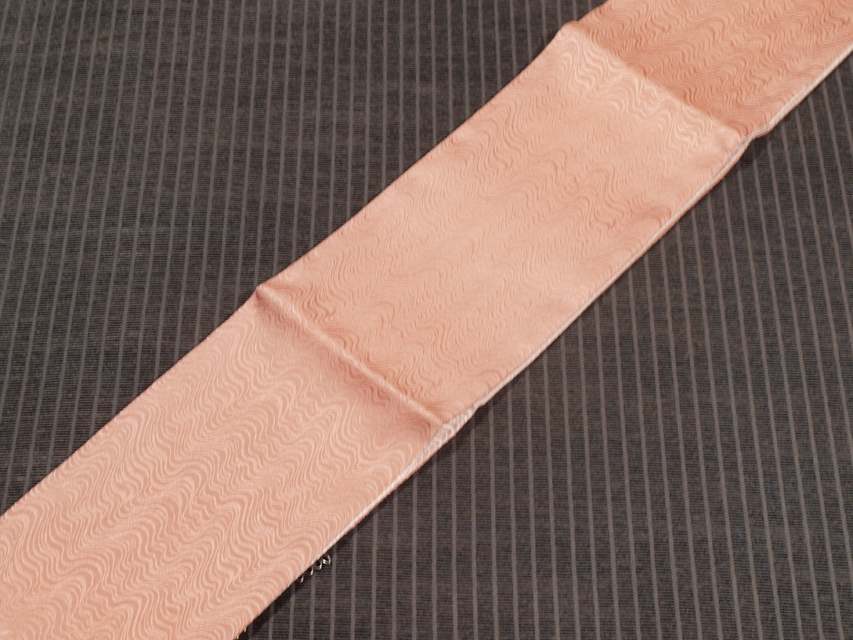 やや沈んだ鴇浅葱(ときあさぎ)色の地に墨流しの地紋が織り出されている綸子の伊達衿です。裏面は灰桜(はいざくら)色です。留めクリップが 3 個付いています。 未使用保管品で、しみやよごれ、褪色などのダメージもなく、新品同様です。 |