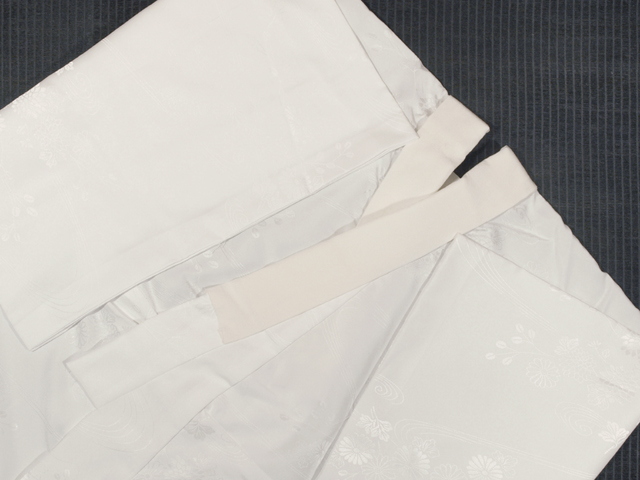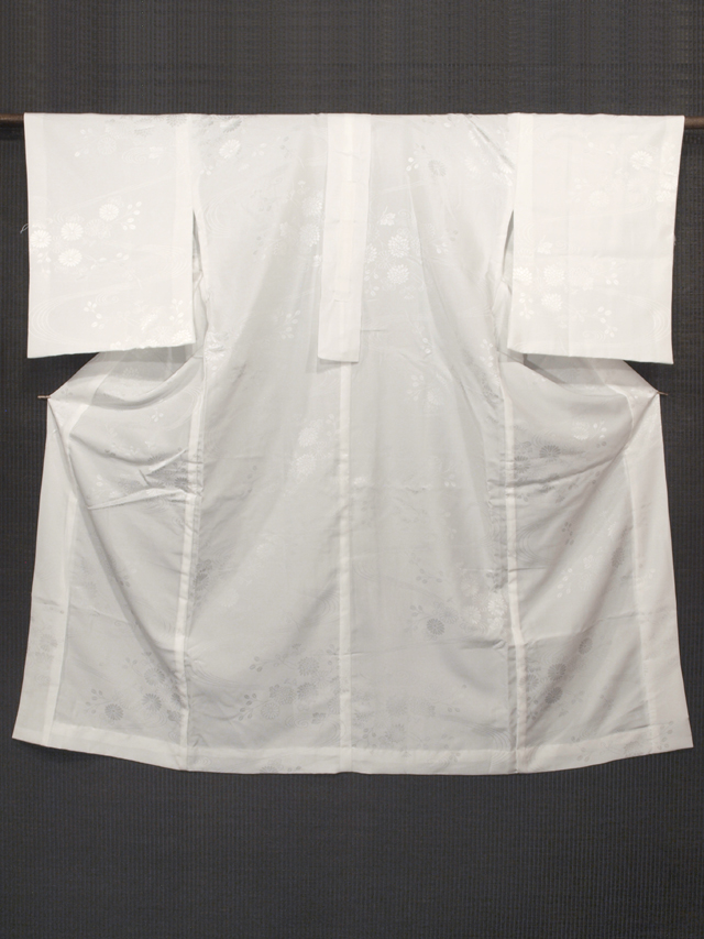 白色の地に流水と菊や萩などの草花の地紋が織り出されている紋綸子縮緬の洗える長襦袢です。袖無双仕立てです。 縮緬の掛衿が付いています。ややシャリ感のある縮緬地です。日本製です。 ユーズド品と思われますが、使用感は感じられません。上前身ごろの胸付近に直径約 1mm の織キズが 1 か所、掛衿の右衿に直径約 0.5mm のごくごくうっすらとした黄変が 1 か所ありますが、ほとんど判別はつかず、気になるようなものではありません。そのほかに目につく大きなしみやよごれなどのダメージはなく、きれいな状態です。 |