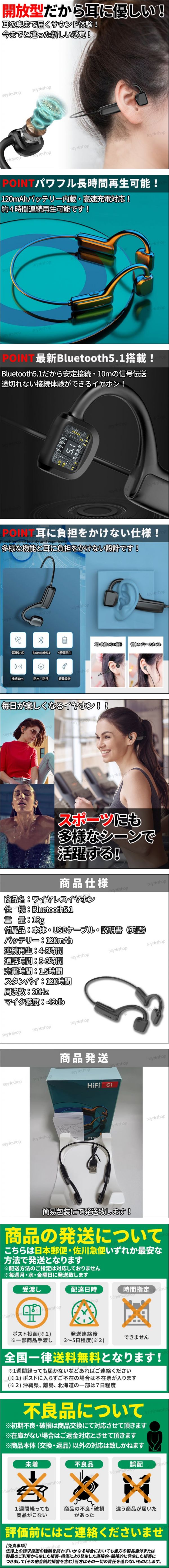 | 【商品】 ワイヤレスイヤホン開放型 【仕様】 ●Bluetooth5.1 【重量】 ●15g 【付属品】 ●本体・USBケーブル・説明書(英語) 【バッテリー】 ●120mAh 【連続再生】 ●4-5時間 【通話時間】 ●5-6時間 【充電時間】 ●1.5時間 【マイク感度】 ●-42db | ||