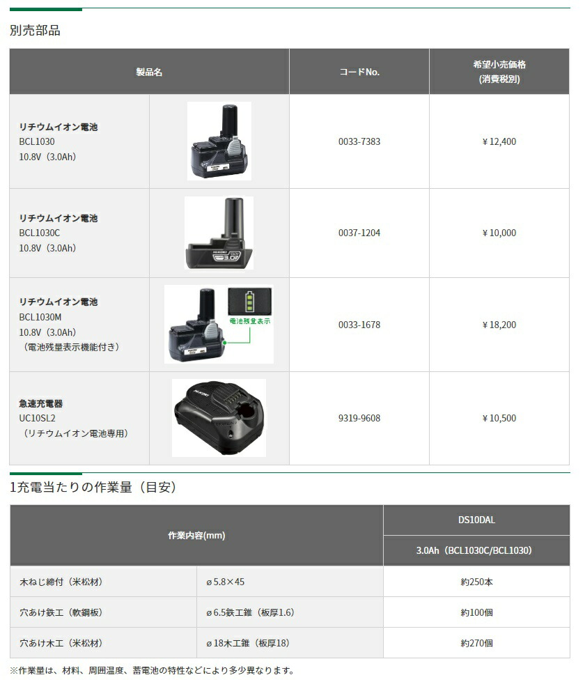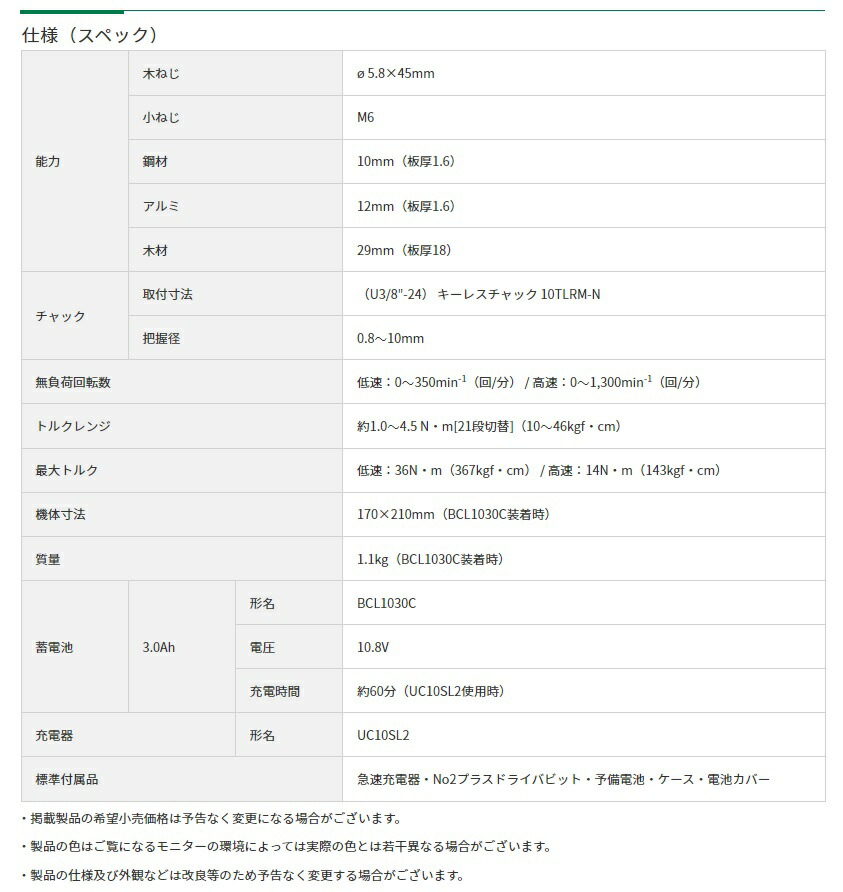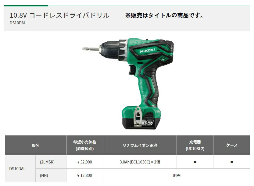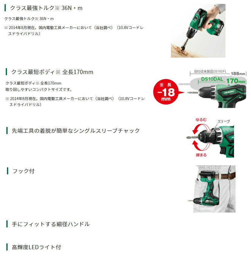 HiKOKI ハイコーキ(旧日立工機)10.8VコードレスドライバドリルDS10DAL(2LMSK)バッテリ(BCL1030C)x2個+充電器(UC10SL2)+ケース付■クラス最強トルク※ 36N・m※ 2014年8月現在。国内電動工具メーカーにおいて(HiKOKI社調べ)(10.8Vコードレスドライバドリル)■クラス最短ボディ※ 全長170mm取り回しやすいコンパクトサイズです。※ 2014年8月現在。国内電動工具メーカーにおいて(HiKOKI社調べ)(10.8Vコードレスドライバドリル)■先端工具の着脱が簡単なシングルスリーブチャック■フック付■手にフィットする細径ハンドル■高輝度LEDライト付