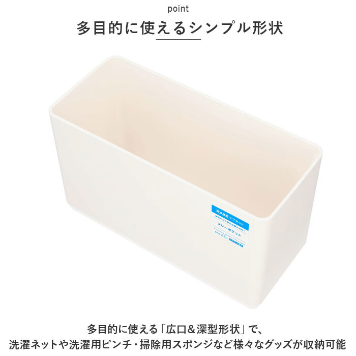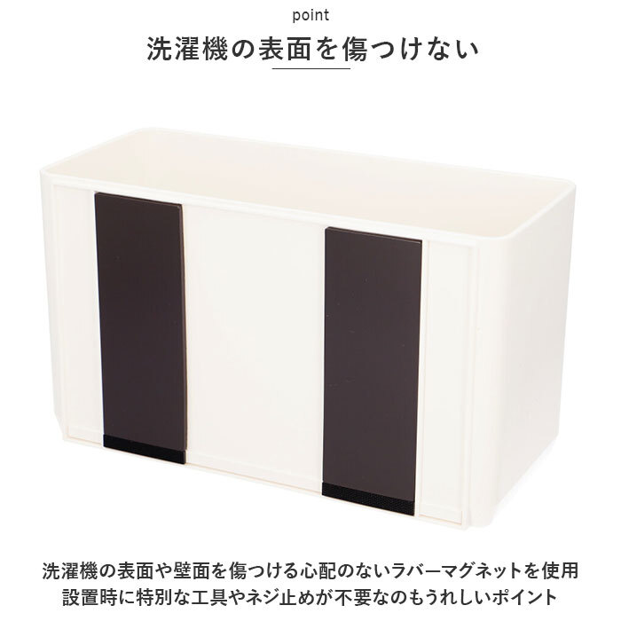| 商品説明 | ・・洗濯機横の隙間スペースを有効活用!サニタリールームがすっきり片付く「RAXE-ラックス- MGフリーポケット」が新登場。 ・【磁石の力でピタッと取付け】 ・フリーポケットの背面のマグネットシートで、洗濯機の側面や前面にピタッとくっついて、取り付け位置の調整も自在。(※ドラム式タイプの洗濯機は側面のみの取り付けとなります。) ・【多目的に使えるシンプル形状】 ・多目的に使える「広口&深型形状」で、洗濯ネットや洗濯用ピンチ・掃除用スポンジなど様々なグッズが収納可能。 ・【洗濯機の表面を傷つけない】 ・洗濯機の表面や壁面を傷つける心配のないラバーマグネットを使用。設置時に特別な工具やネジ止めが不要なのもうれしいポイント。 ・【耐荷重2.5kg】 ・耐荷重2.5kgまで対応したタフなつくりで、洗濯用洗剤や柔軟剤のボトルなど少し重みのある物を収納しても大丈夫! ・【清潔感のあるカラーリング】 ・ホワイト1色のすっきりとしたモノトーンカラーが、サニタリールームを落ち着いた雰囲気に演出! ・【様々な場所でマルチに活躍】 ・ユニットバス壁面や洗面化粧台のキャビネットなど、鋼板を内蔵した壁面であればどどこにでも気軽にセッティング可能。使い方はアイディア次第♪ |