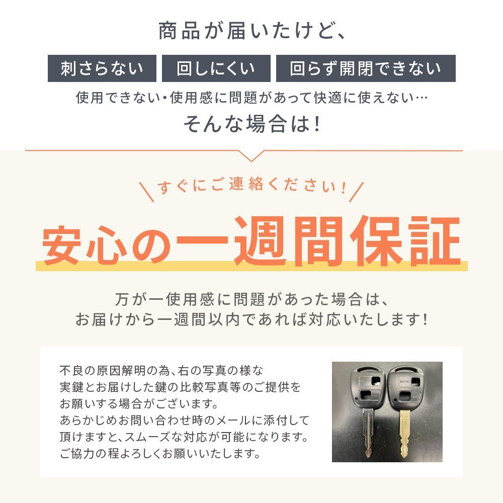 | 対応車種はあくまで参考です。 ブランクキーは同年式・同車種でもオプション等により数種類ございますので 車種、年式、型式などからは1種類に特定できず、 お手持ちのマスターキーと【形状、サイズ】を見比べてお客様に判断して頂く必要がございます。 また、キーレスのトランスミッター(送信機)は付属いたしません。 純正キーに内蔵されているものを引き継いでご使用ください。 ![]() ※こちらの商品はご注文受付後のキャンセル、返品は不可となります。 ※キーナンバーが分からない場合は未カットのブランクキーの発送となりますので、ご注意くださいますようお願い申し上げます。 スペアキー、鍵の折れ、割れ、傷汚れ等にお安く改善が可能です。 内部のキーレス送信機は付属致しておりませんので純正のものを流用下さい。 社外品のため、メーカーロゴは入っておりません。 車種や年式で数種類ございます。 当店では車種・年式・車検証では特定できかねますので、 お手元の鍵と販売ページの写真、リモコン部及び鉄のブレード部の形状を見比べて お客様にて判断していただくようお願い申し上げます。 ・ボタン数:1個 ・参考キーナンバー (キーナンバーだけでなく実際の鍵と掲載画像を必ずご確認ください) H001 - N718 ※ただし、Jナンバーの場合は別途キーのお写真を頂き、キーナンバーを確認させて頂きます。 ・参考車種 フィット ヴェゼル フリード ステップワゴン オデッセイ CR-Z CR-V ジェイド グレイス シャトル インサイト など ・サイズ(キー部分):長さ:約45mm 幅:約9mm 厚さ:約3mm ・当店では車種・年式・車検証で特定できません。 画像のキー形状とカバー形状、サイズをお手元の鍵と比較しご確認ください。 ![]() ![]() ![]() ■注意事項 ・当店ではお車への適合の確認や取り付けに関するサポートはおこなっていませんので、お車への適合やご使用方法につきましては専門店さまなどにご相談ください。 ※製造・流通過程(商品同士の擦れ)において、商品に多少の擦り傷や汚れなどが発生する場合がございますのでご了承ください。 ※当商品はインポート商品の製品(バルク品)のため、メーカー保証書や説明書などは付属しておりません。 ※梱包は装飾された箱ではなく簡易包装での出荷となります。 |