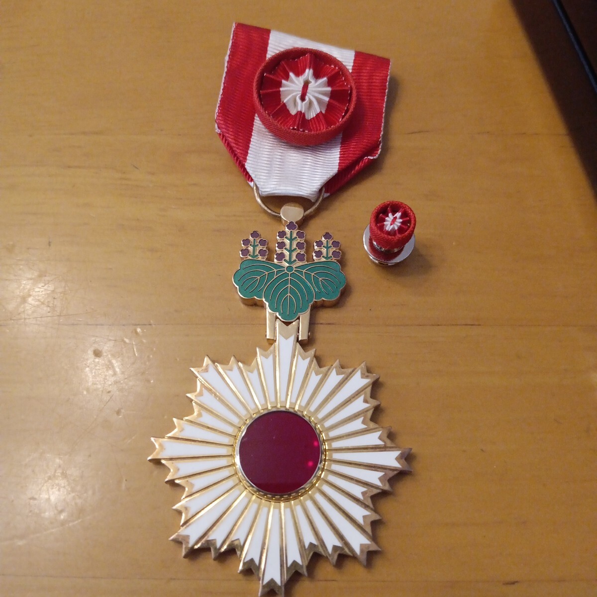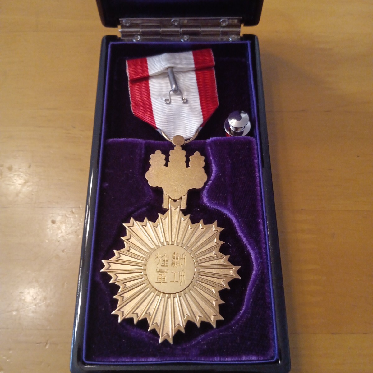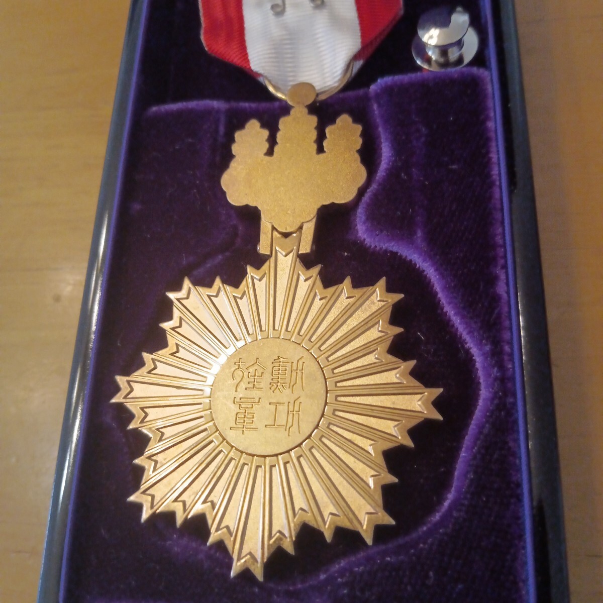 現行の旭日小綬章です。旧勲四等旭日小綬章で、H15の制度改正後勲四等と序列が廃止されました。発行間もないので、出回りも少なく、貴重な品物と思います。