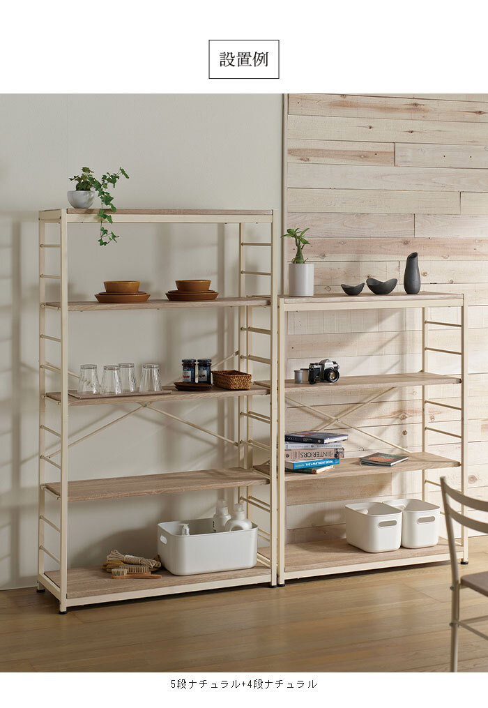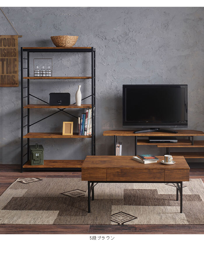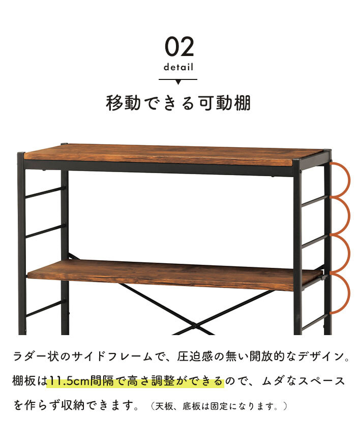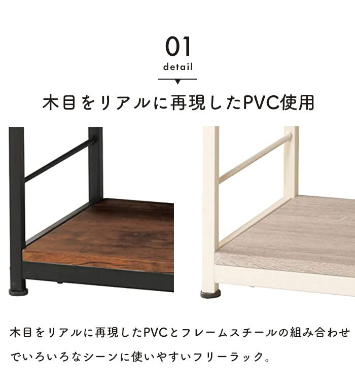 | 木目をリアルに再現したヴィンテージ風の木目PVCとブラックカラーのスチールフレームを組み合わせたおしゃれなオープンラック。 古木風のブラウンカラーと黒いフレームが相まって重厚感のある、どことなくヴィンテージな雰囲気を漂わせます。 棚板は11.5cmピッチで高さ調節が可能。 |
