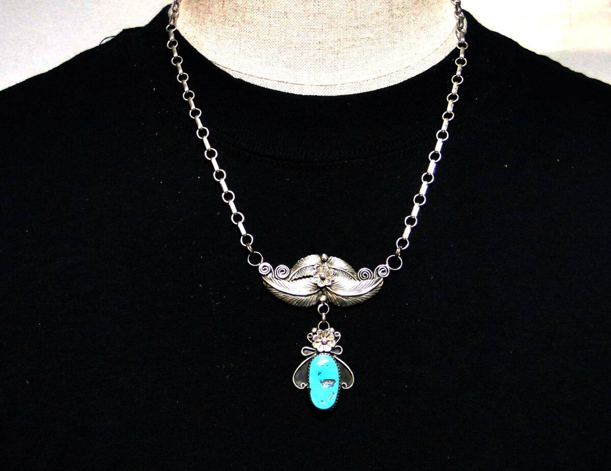 1980年代品、、、 NAVAJO- VINTAGE ネイティブアメリカン クラフトドロップ ネックレス 伝統的な羽、 サボテンの花、 レインビーズの デザインを 特徴とする、 ソリッドファイン スターリングシルバー ドロップには、 楕円形の 磨かれた ターコイズ ジェムストーンが 鋸歯状の エッジベゼルに セット、、、、 ◆商品詳細 ナバホ族 /アーティスト ;特定不明 (I.D.刻印入) ▲サイズ;シルバーリフ; 縦2.18cm 横6.12cm 重さ24.5g ターコイズサイズ; 縦2.29cm 横1.25cm チェーン長さ (左右、共22.5cm) 新品・1980年代品 ・Made in U.S.A.・送料込 VINTAGE ビンテージシルバー 特有の 燻がございます。 十分にご検討の上、 決断をお願いします。 | ||||