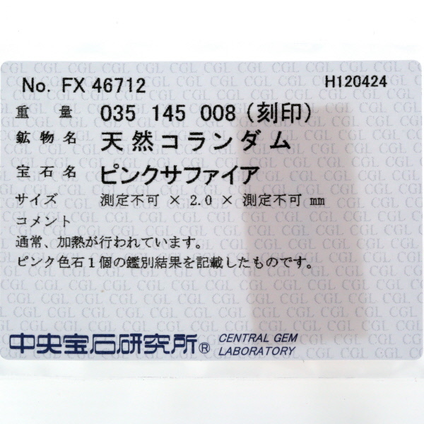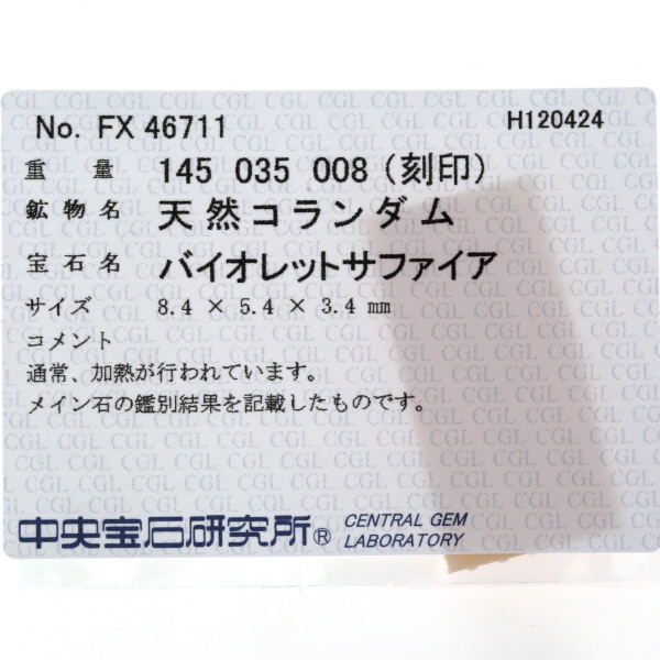 | 石目 | ダイヤモンド 0.08ct バイオレットサファイア 1.45ct ピンクサファイア 0.35ct |