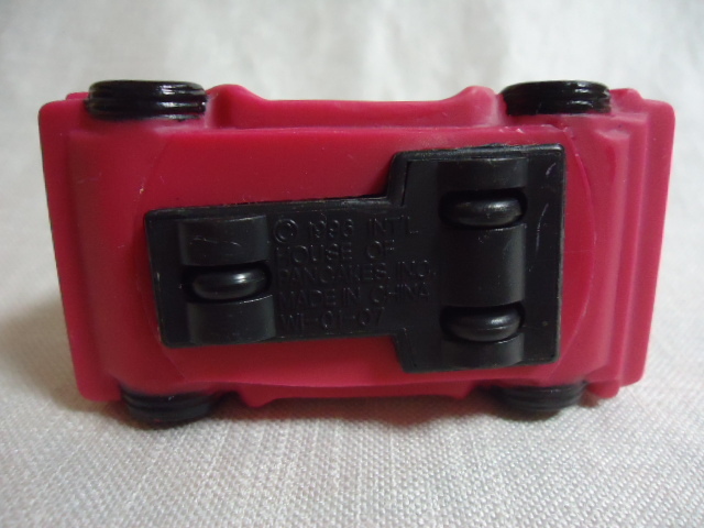 米国にて、USED物として、購入しました。1996年製。米国IHOPで、出たミールトイの1点です。プラスチック・ゴム製。タイヤ、動きます。USED物なので、少々キズ・薄汚れあります。サイズは、全長約7.8センチ・車幅約4.2センチ・高さ約6センチです。USED物なので、ご理解のある方・24時間以内に、お手続き入力後、期限内にかんたん決済、出来る方のみ、ご入札をお願い致します。この商品は、1点物です。
