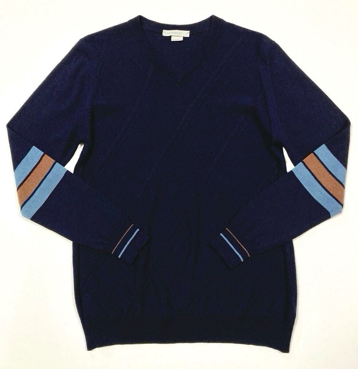 肘辺りと袖口のリブ部分にラインデザイン、前見頃にはアーガイルチェック柄にジャガード編みがデザインされた、「JOHN SMEDLEY」のコレクションの中でも凝ったデザインが見て取れる一着になります。
