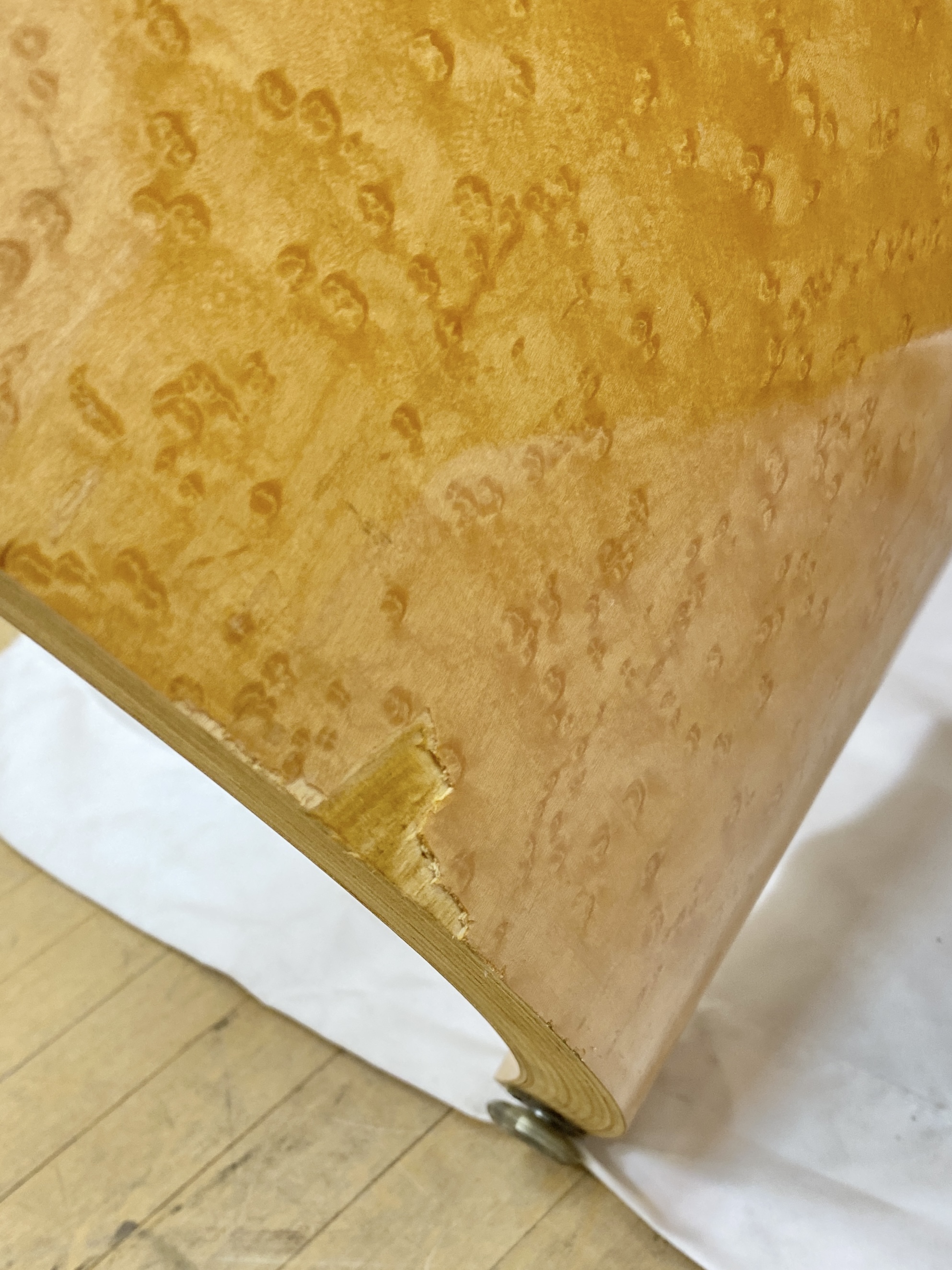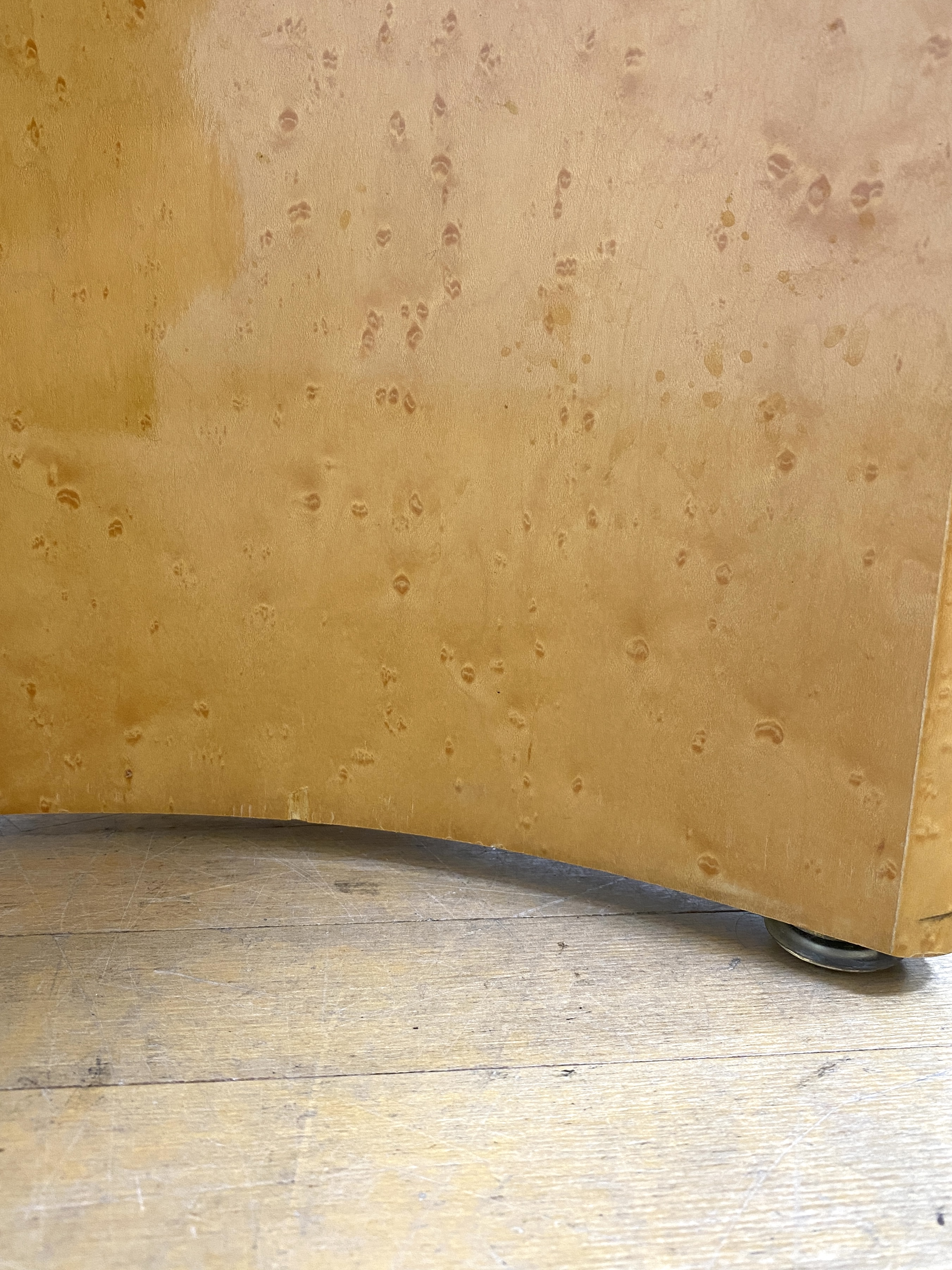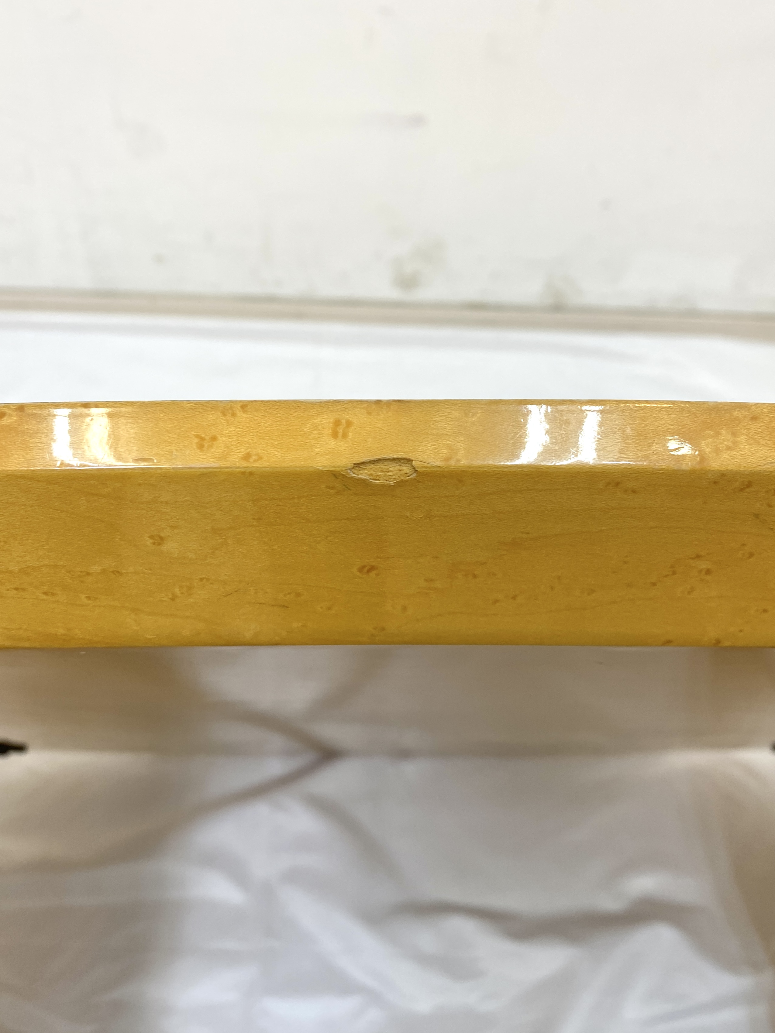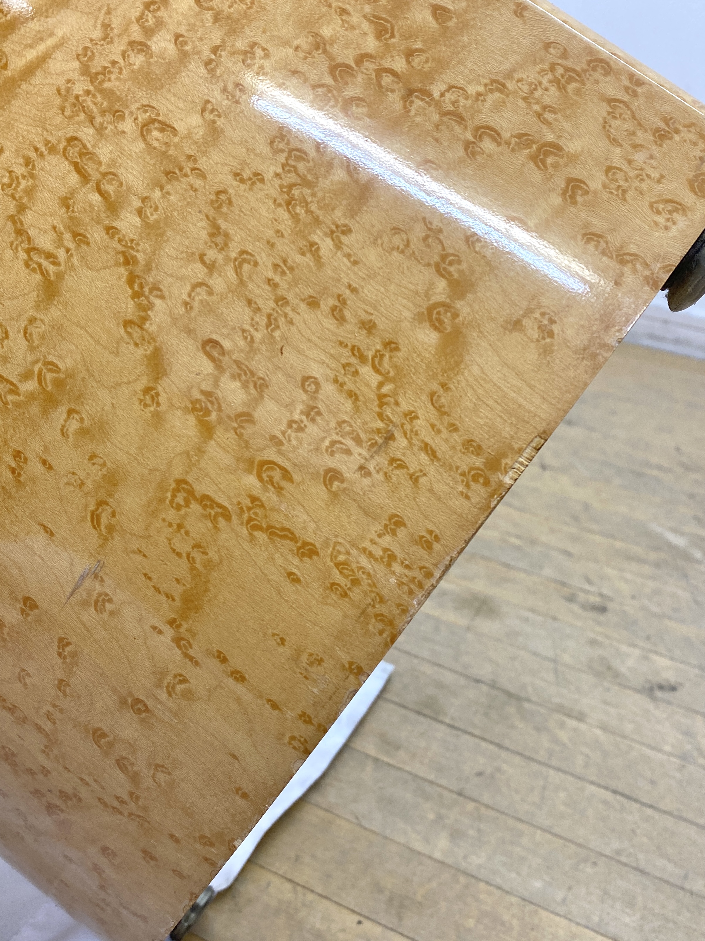 こちらはバーズアイメープル材 センターテーブルです。 中古品です。 希少なバーズアイメープル材を使用したセンターテーブルです。 バーズアイメープルとは、ハードメープルに鳥目模様(バーズアイ)が現れた木材です。 表面近くでしかとれない大変貴重な材で、丸い玉のような模様が連なったり渦巻状になって現れる杢目が特徴です。 鳥の目に似た模様が集まっているところから“鳥目杢”(とりめもく)とも呼ばれています。 ご紹介するお品は、バーズアイメープル材を贅沢に使用したオーバル型のセンターテーブルです。 素材の美しさを引き立てるシンプルなデザインで、空間に彩りを与えてくれます。 天板の中心には象嵌細工が施され軽やかな印象。艶のある表面コーティングも素材も良さを引き立てます。 メープル材は堅さのある素材のため、反りや割れが起きにくいといった特徴があります。 全体に明るく清潔感のある色合いなので、他のインテリアとの相性も良さそうです。 【コンディションについて】 全体に薄い擦りキズがあります。天板の縁や脚部には表面材が剥がれている部分があります。 画像に載せた箇所以外にも、欠けや薄い剥がれがありますのでご承知おきください。 使用感はありますが、上質な素材を使用した、細部まで丁寧に仕上げられたお品です。 長きにわたりご愛用いただける家具となっています。 他詳細については下記画像も併せてご参照ください。