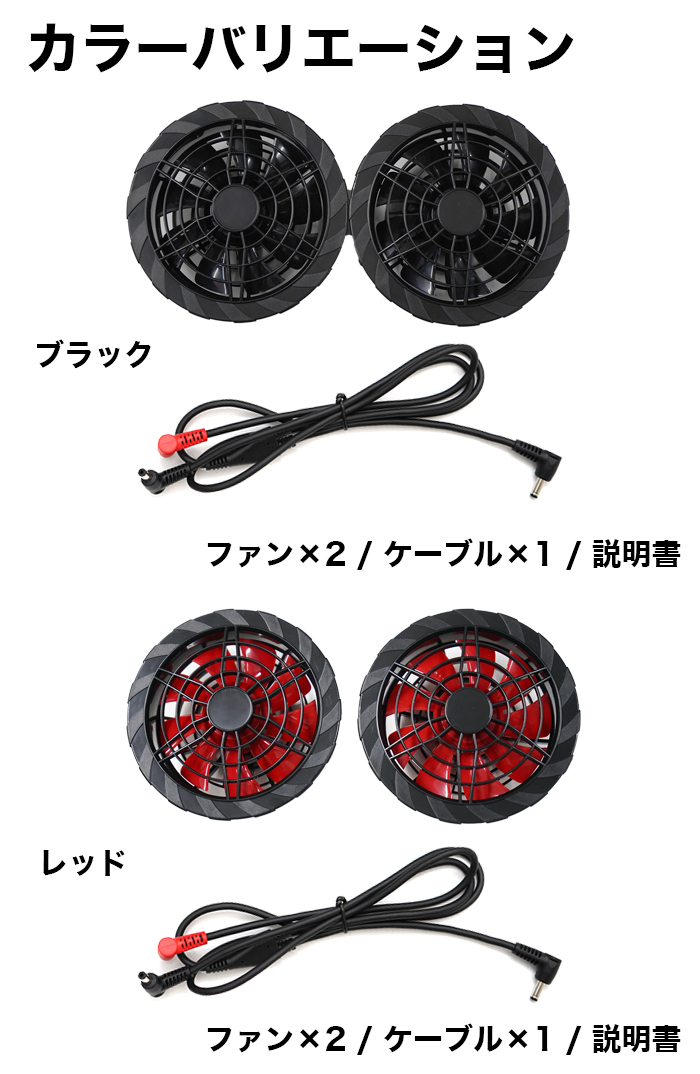 | 弊社、別途販売の空調作業服用バッテリーに対応! 現場作業や夏のアウトドアや日曜大工、ガーデニング、犬のお散歩など様々なシーンで活躍! ■商品仕様 ・モーター:ブラシレスモーター ・使用時間:約3000時間 ・12V使用時の回転速度:5500RPM±10% ・接続端子:3.7mm ・弊社、別売販売のHYPERバッテリー使用時:約6時間(12V駆動時) バッテリー品番:FJ3965 ■カラー ・ブラック ■セット内容 ・12V対応ファン左右セット×1 ・ファン接続用ケーブル×1 ※2022年式バートル製(AC300/AC310)はジャックの形状が異なる為、使用できません。 |