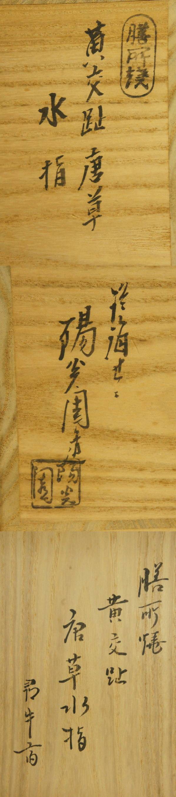 十二世久田宗也尋牛斎の書付が共箱蓋裏にあり、塗蓋の蓋裏に花押が朱漆で書かれた