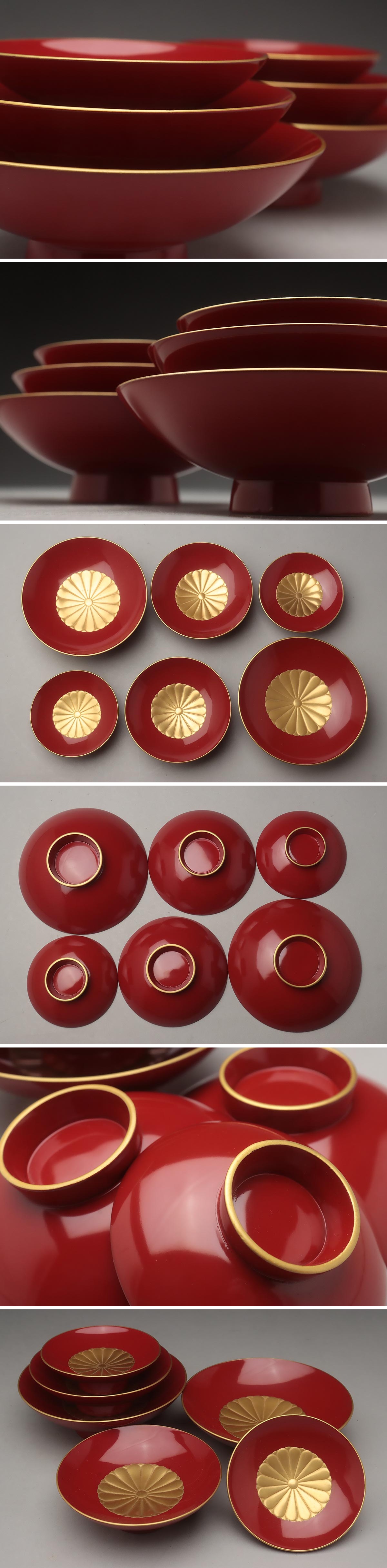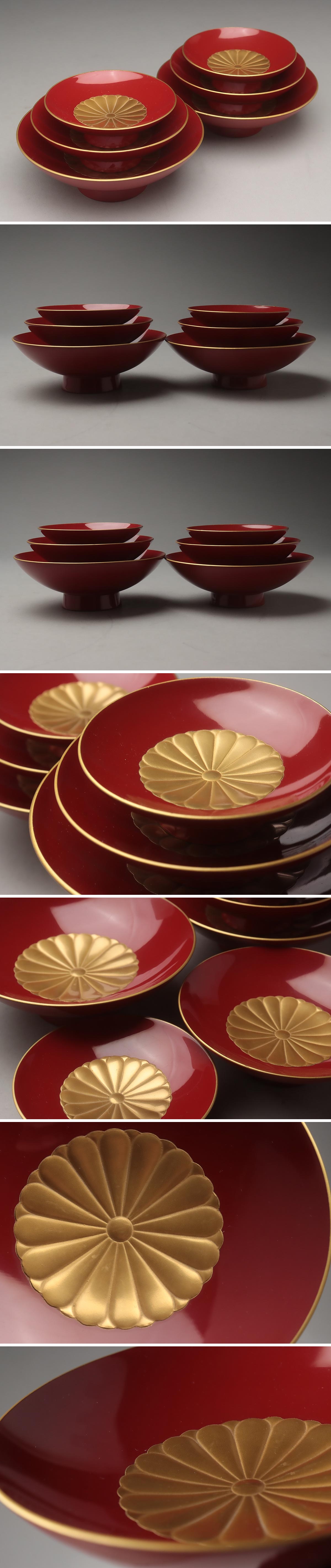 ◆ 時代漆工芸 御下賜品 朱塗 縁金塗 菊御紋 金蒔絵 三つ組盃・菊蒔絵三ツ組杯・蒔絵杯 二組 酒器 古美術 検)天皇家 ◆