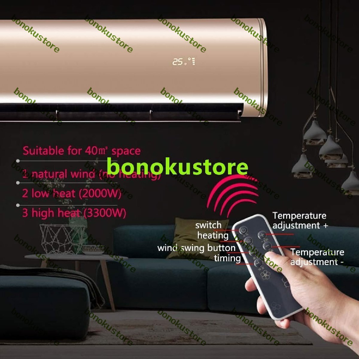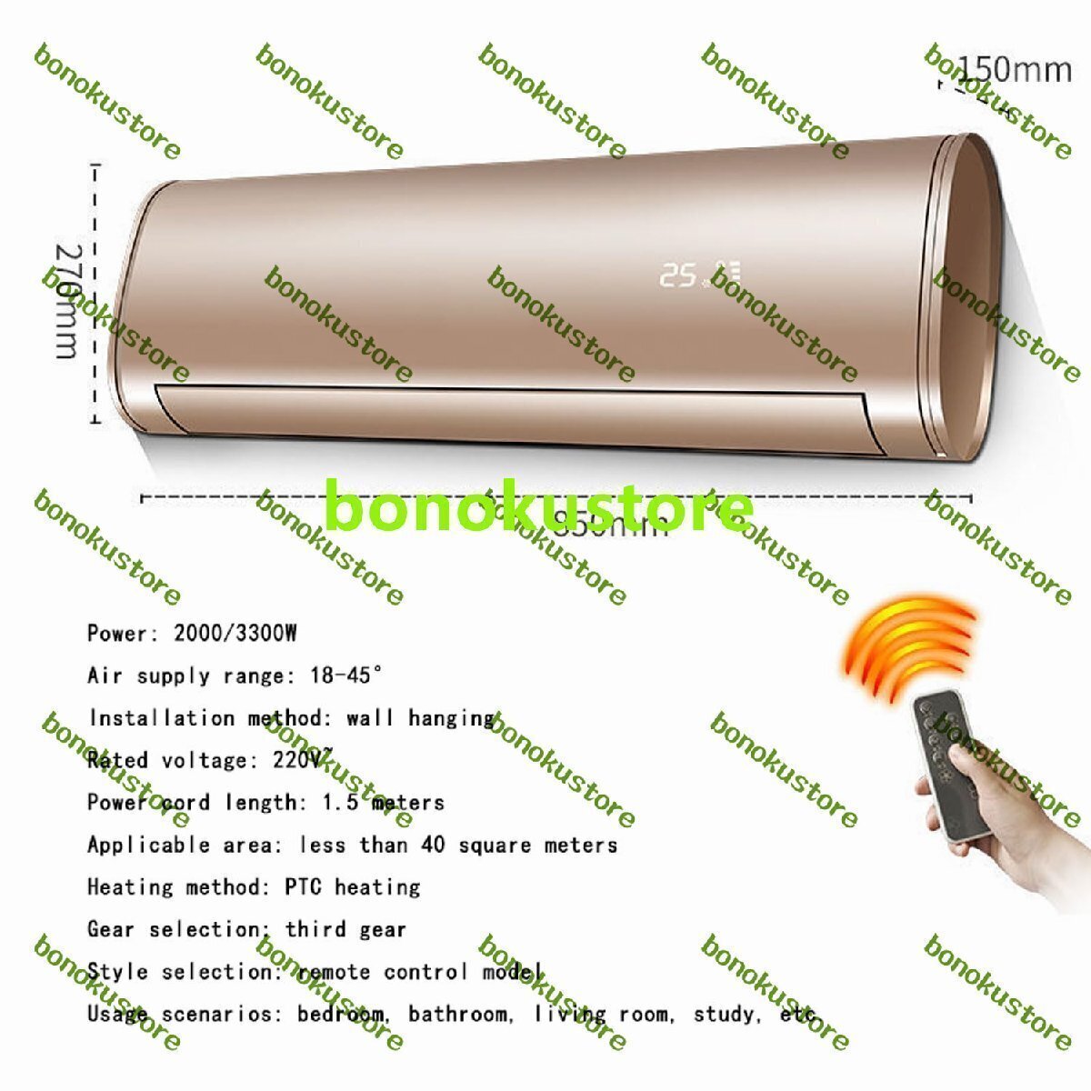 電力: 2000/3300W 給気範囲:18~45° 設置方法:壁掛け 定格電圧:220V~ 電源コードの長さ: 1.5 メートル 適用面積:40平方メートル以内 加熱方式:PTC加熱 ギア選択: 3 速ギア スタイル選択: リモコンモデル 使用シナリオ: 寝室、バスルーム、リビングルーム、書斎など。