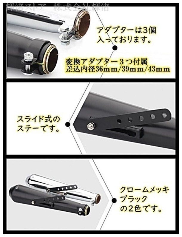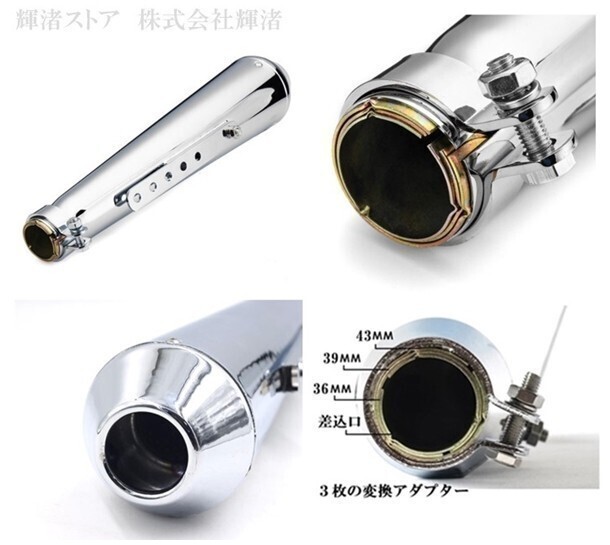 | 商品説明 | ご覧いただきありがとうございます。 【発送方法】 日本郵便ゆうパック(提携版) (1-2営業日以内に奈良県から出荷致します。) 【カラー】 艶消ブラック 【内容】 スリップオンマフラー本体×1本 固定リング ボルト、ナット、ステー 変換アダプタ( 約36mm/約39mm/約43mm)※割が入っているため約表示 ※別ページにて2本セットを出品しております。 【材質】 製品の材質:鉄(スチール) 製品重量:1914g (スリップオンマフラー+付属品すべてを一括計量時) 商品側の差込口内径が 約45mmです。 【備考】 中に脱着不能のパンチングサイレンサーが入っております。 更に音量を落とされる場合には、 干渉しないサイズのインナーバッフルをご用意いただき 穴あけ 取付加工が必要です。 【梱包】 また他の販売先よりも安く販売させていただいており、 再利用段ボールにて梱包となる場合がございます。 【適合判断および取付加工について】 差込径が45mm以下であれば、基本的には装着が可能ですが 実車を確認しないとわからないため、回答できません。 ご自身で適合するかが分からない場合は、 バイクショップなどの専門業者にご相談を推奨します。 汎用品のため、付属のステーのまま装着できないケースもあり また、差込口から排気漏れをしないように加工が必要なケースもあります。 ■商品についての詳細仕様書・説明書は付属しておりません。 ■輸入品のため使用に支障の無い小スレ・小キズなどある場合がございます。 ■入荷ロットにより仕様変更がある場合がございます。大きな変更があった場合は商品画像を変更致します。 ■車両名の記載が有る場合でも、汎用品ですので車種により取付可否と取付時の加工内容が異なります。 ■ご購入前に現車の形状確認をお願い致します。 ■社外の汎用部品につき、多少の加工を要する場合がございます。 ■作業などショップ様にご依頼する場合は |