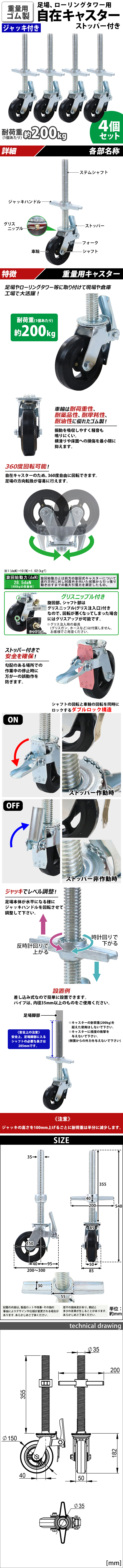 | 商品名 | 送料無料 キャスター 足場キャスター ジャッキキャスター 自在キャスター 重量用 ゴム製 ストッパー付き 4個セット 耐荷重約200kg(1個あたり) 車輪直径約150mm 幅約50mm 自在車 ゴムキャスター ゴム車輪 ラバー ジャッキ付き ローリングタワー 高さ調整 scacs60rus51r4p |