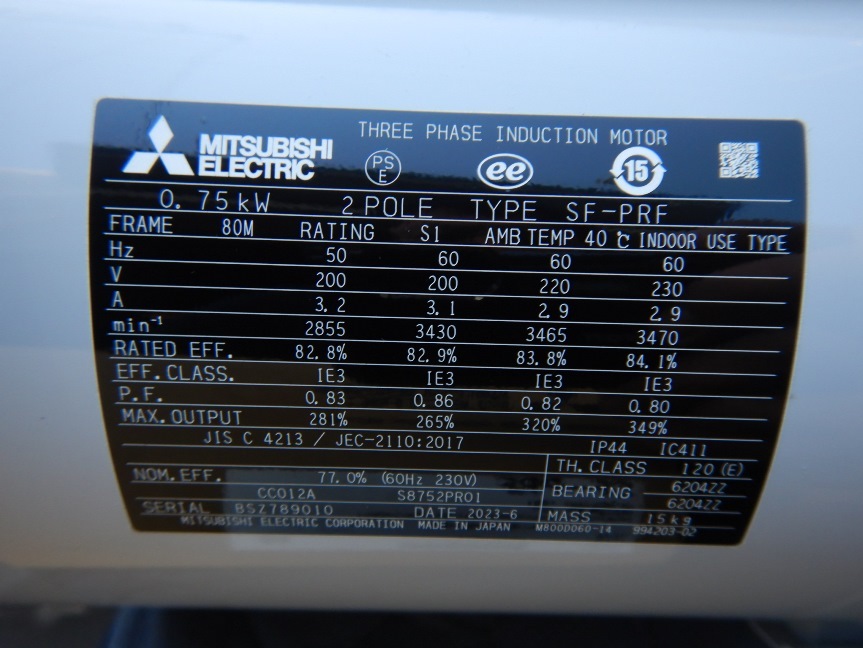 即決税込 未使用品 三菱 三相200V 0.75kw 極数2Pモーター SF-PRF 0.75kw 2P 全閉屋内フランジ形 全閉外扇型 ======================== 0.75kw 2POLE 50/60Hz (200V) 220V 60Hz 電流 3.2/3.1A 回転数 2855/3430回転/min 220V 60Hz 3465回転/min(2.9A) 重量 15kg 軸径 19mm 全長 約265mm(実寸) フランジ外径 200mm フランジ内径 130mm 定価 102740円 未開封品を当店で開封したものです。 製造は2023年以降になります。 極数は2Pです。 よく使われている4Pモーターに 比べて回転が速いので ご注意ください。 フランジに取りつける タイプのモーターです。 台座はありません。 使用するために購入し 保管されていたものを 当店にお売りいただいたものです。 外箱は保管の影響で 若干の汚れ、くすみがあります。 中身には影響はありません。 使用するために購入し 保管されていたものを 当店にお売りいただいたものです。 そのため、メーカー保証は お付けできません。 保証としましては 当店の一か月保証となります。 詳しくは下記保証内容を ご参照ください。 ================ 即決ですので入札=落札です。 落札価格は消費税込みの金額です。 早いもの勝ち!! ================ |