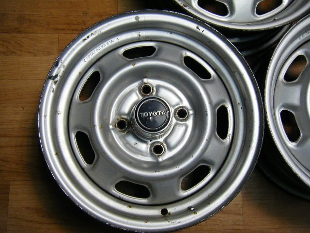 中古ホイールです。 ・TOYOTA トヨタ 純正 スチール 14×5.5J 4H-114.3 +29(実測) (4本) ・14×5.5J ・4穴 ・PCD 114.3 ・オフセット +29mm(実測) ・ハブ径 60mm ・4本セット エアバルブ・ナットは付属していません。 画像の様な傷や錆等があります。点検時ブレや歪みはありませんでした。 *送料は離島を除く全国一律5500円です。離島の場合はご相談下さい。 |