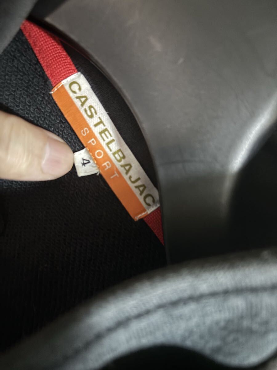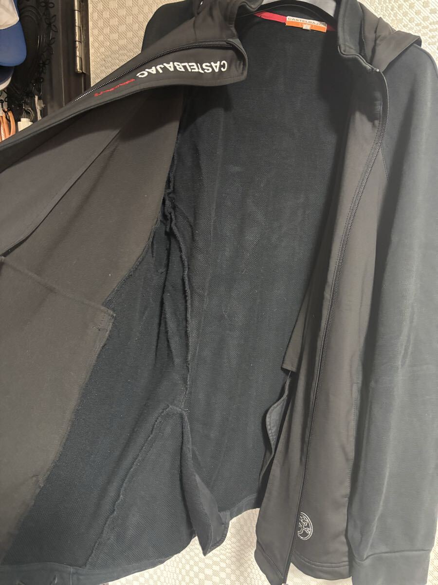 カステルバジャック の取り外しできるフードが付いたトラックジャケットです。サイズ4表記で平置き脇下身幅62着丈70センチ位です。裾はドローコードが付いています。