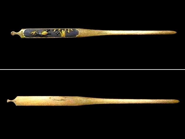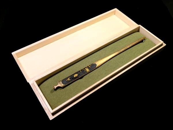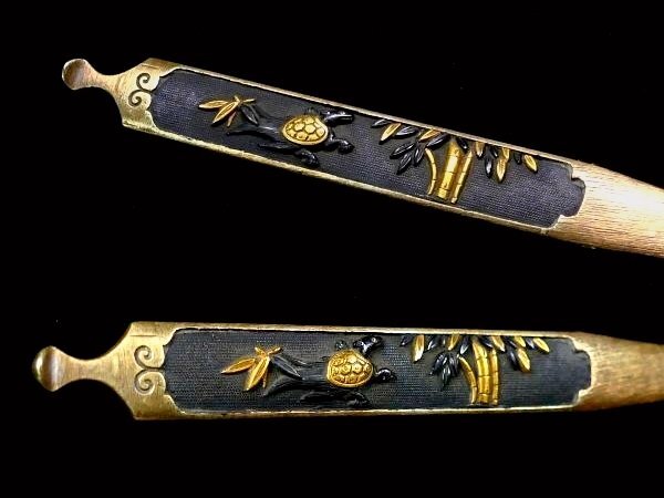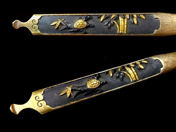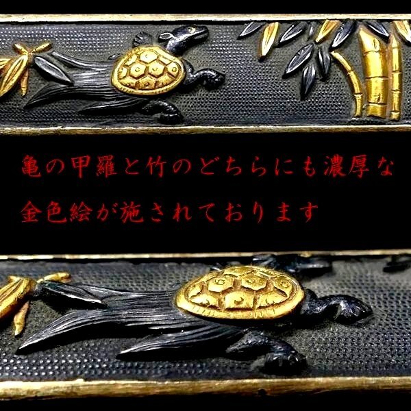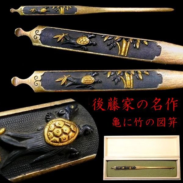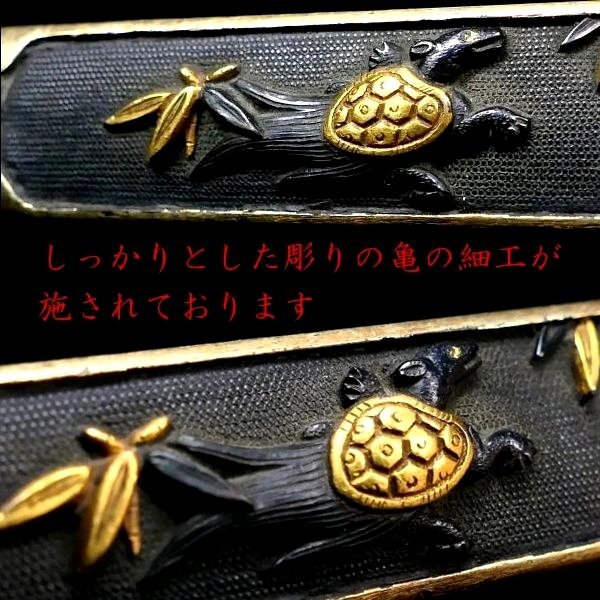 | 商品説明 | 黒々とした赤銅魚々子地に 華やかな金色絵と 見栄え良き「亀に竹」が細工された 拵栄えする一品です。 作行から見て 後藤家の名作と推測しております。 詳しくは画像にてご確認下さい。 観賞用にも拵用にも 幅広く活躍する作品でございます。 この機会に是非手に入れて下さい。 寸法: 約 21.1cm × 約 1.23cm 時代: 江戸時代 材質: 赤銅魚々子地 桐箱付 銘 : 無銘 状態:特に気になる傷みはなく良好。画像にてご判断下さい。 :許容範囲内の時代傷みはご理解下さい。 |