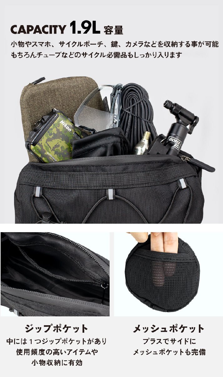 収納力は約1.9Lで小物やスマホ、サイクルポーチ、鍵、カメラなどを収納する事が可能です。