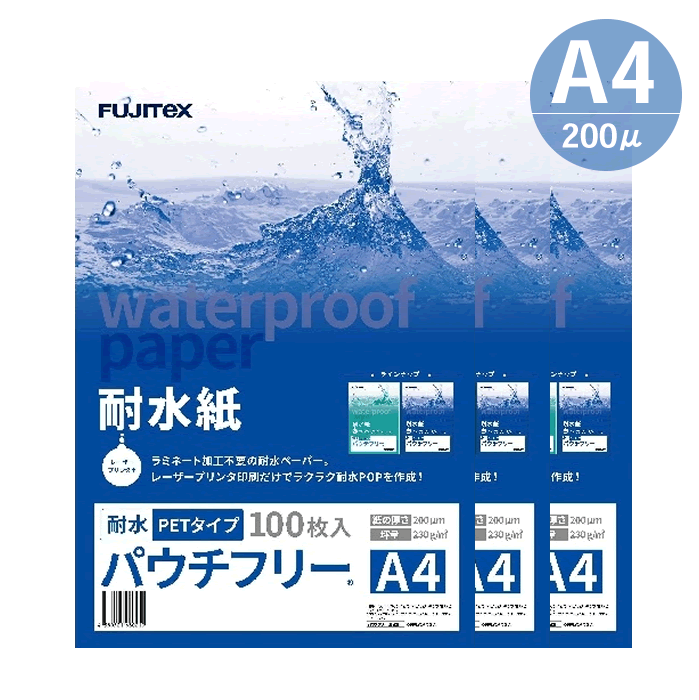 ラミネート不要の耐水紙で業務効率化アップ!! レーザープリンターで印刷するだけで そのまま店舗のメニュー・POP・プライスカード・貼り紙等に活用できます。 |
