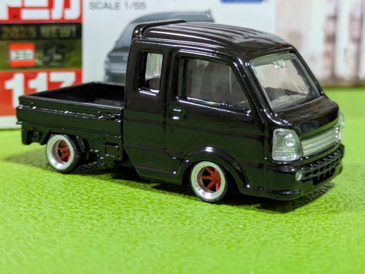 ★トミカ スズキ スーパーキャリイ改(ブラックに再塗装)深リム、ローダウン他にも色々出品中! (検索用、トミカ、京商、グラチャン、深リム、ローダウン、トミカリミテッド、トミカプレミアム)現状渡し、タイヤは回転しません。未使用品のモデルを使用していますが改造の際、シャーシ、ボディ内側、等を削っていますのでジャンク扱いでお願いいたします。量産品のモデルを使用していますので、塗装ムラや浮き、デカールのズレ、キズ等がある場合があります、素人の趣味の範囲の作製ですので仕上げが荒い部分も有るかと思いますので神経質な方は入札をご遠慮下さい。迅速なお取引を心がけますが、当方、仕事の都合上、連絡が遅くなる場合があります。他にも出品していますのでよろしくお願いいたします。