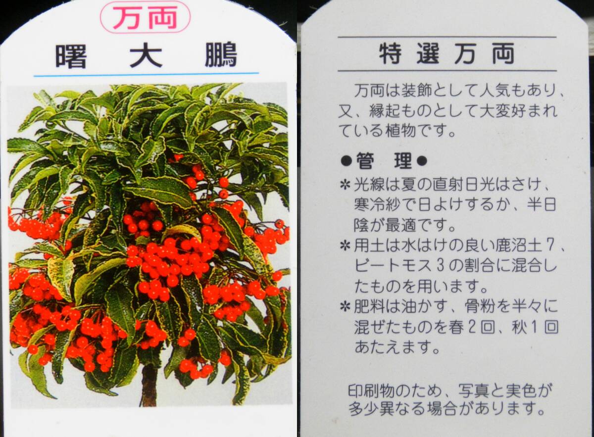 | 何個かの購入商品を一箱にまとめて発送する場合は、送料は一箱にまとめた発送時の箱サイズの送料となります。 一箱での発送希望の場合は、名前や住所等の連絡の前に、先に「まとめて取引」希望の連絡を当店にして来てください。 まとめて取引が大丈夫な場合は、当店より「まとめて取引」の設定をした後に、御連絡致します。 発送時の送料も、設定後に御連絡致します。一箱にまとめられない場合もありますので、その旨は御了解下さい。 NO:001117100 ■大きさ■ 高さ:鉢底より約32cm~約35cm ※全体の大きさは、「コップ約12cm」と比較して見て下さい。 ■撮影日11月17日 万両斑入葉「品種名:曙大鵬」の人気万両となります。 科目:サクラソウ科 属名:ヤブコウジ属 ※鉢はプラスチックの5号鉢です。 ※何個かの出品商品となりますので、お届け商品は写真とほぼ同じような商品の発送となります。株の大きさや形などには、多少のばらつきがあります。その旨御了解のうえで購入を御願い致します。 綺麗な斑入葉が人気の「曙大鵬」の斑入葉万両となります。 万両の中でも、とても人気のある斑入葉品種です。 毎年実を付けてくれる、丈夫で育てやすい人気の実成り種です。実も赤く色付き見頃となっています。 しっかりと実を付けこれから春までの期間、実が楽しめると思います。 写真を良く御確認のうえで購入を御願い致します。 ※出品中に、気温の変化と共に葉や実の様子は変って行きます。その旨御了解の上で購入を御願い致します。 ***連絡事項・注意事項*** ※出品商品は植物ですので日々変化して行きます。出品中に気温の変化と共に出品商品の様子は変って行きます。その旨御了解の上で購入を御願い致します。 写真とは多少異なる場合もありますので、その旨御了解下さい。 ■日曜、祭日は、当店休業となります。御連絡及び発送は出来ませんので、その旨御了解ください。 夜19時以降の連絡は、翌日以降の連絡となることがほとんどですので、その旨御了解下さい。 ■配達日・時間の御希望■ ※配達日や時間指定がありましたら、御連絡下さい。 ※出品商品の盆栽の中には、盆栽鉢特有の細かな欠け・ヒビ・塗りヒビ・傷・汚れ等がある鉢もありますので、その旨御了解の上で購入をお願い致します。 |